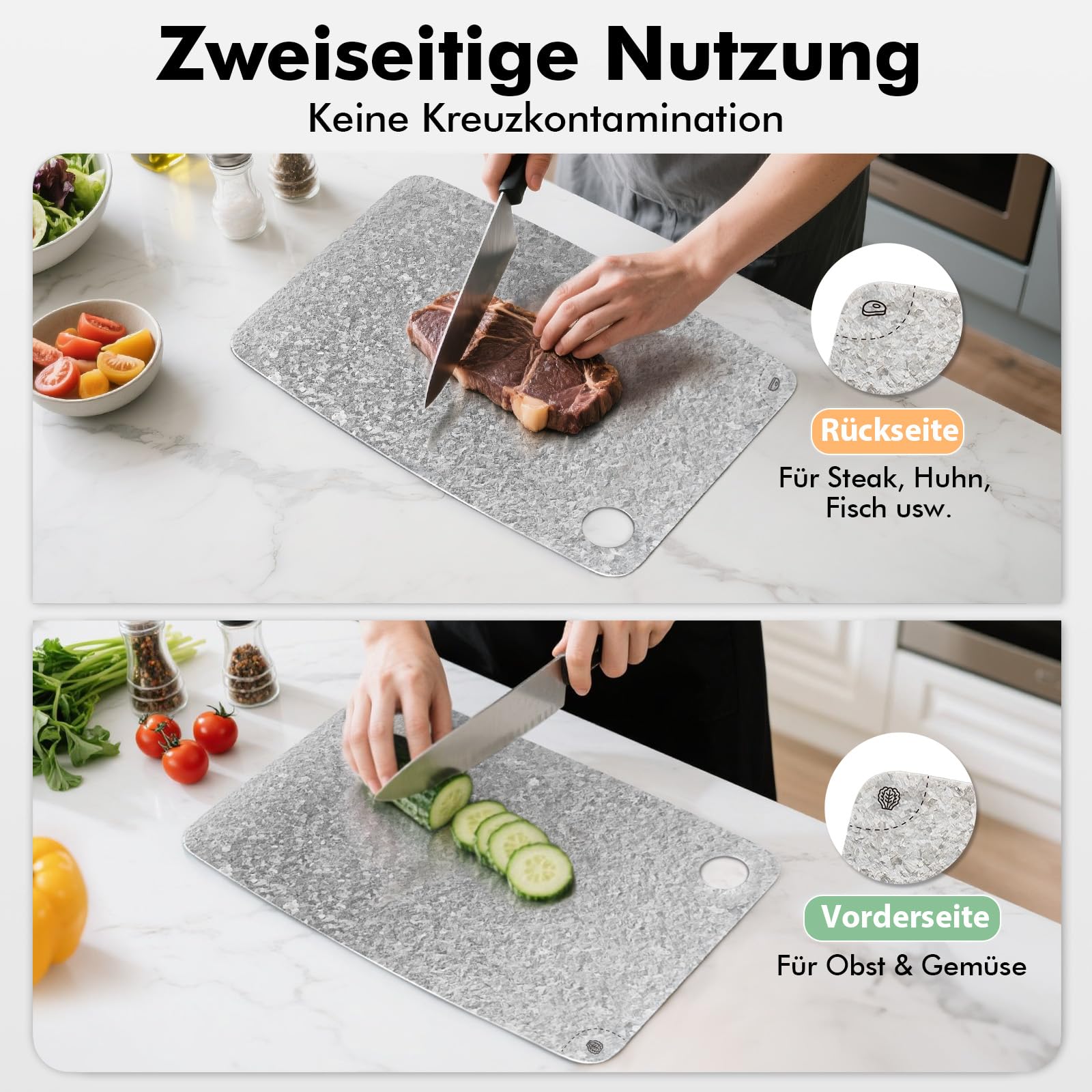 - Durchdachtes Design: Doppelseitig nutzbar, mit einer Seite für Obst und Gemüse und der anderen für Fleisch, um Kreuzkontaminationen zu vermeiden.