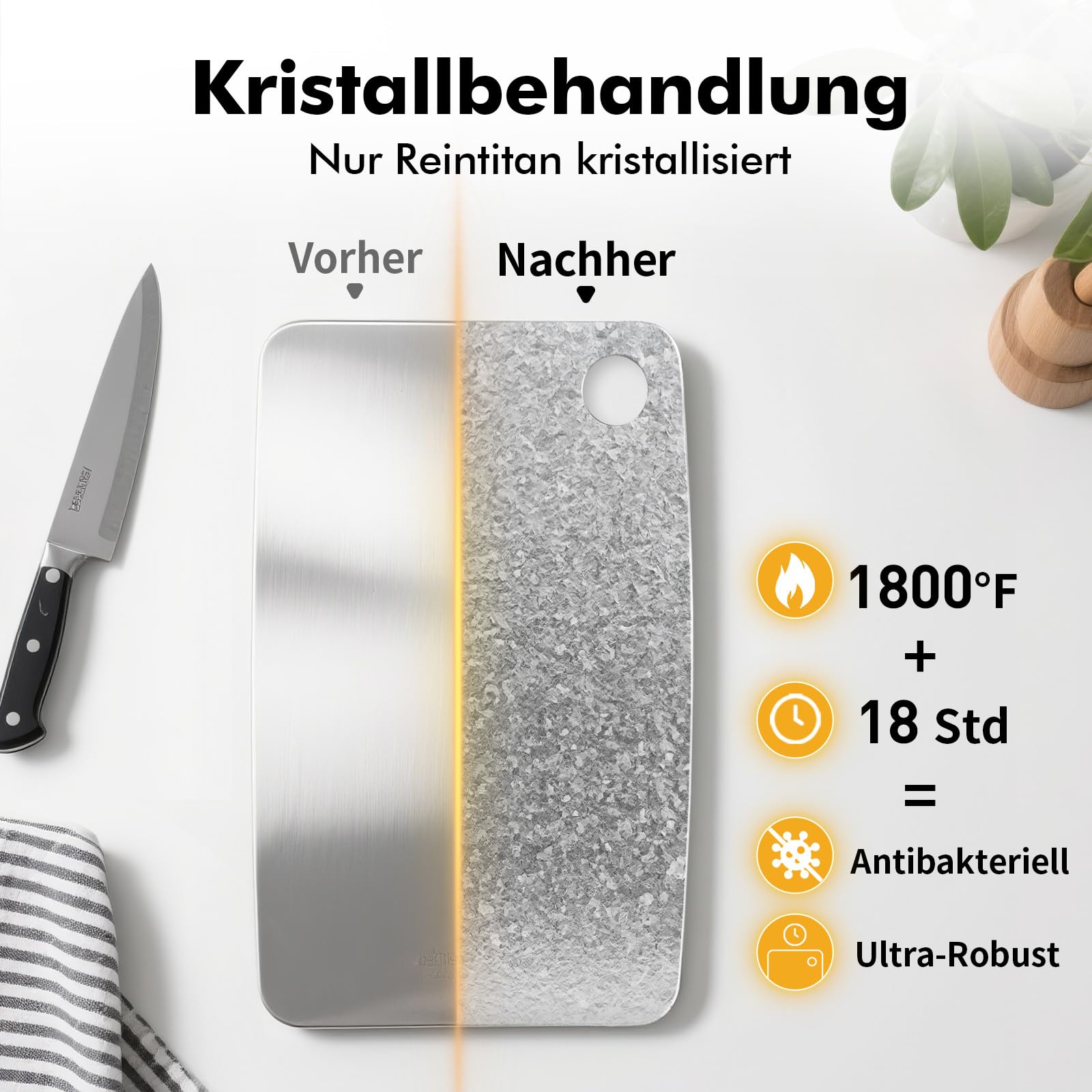 Entdecken Sie die neue Generation der Küchenhygiene mit diesem innovativen Schneidebrett, das vollständig aus 100 % reinem Titan gefertigt ist und höchste Ansprüche an Sauberkeit und Langlebigkeit erfüllt.