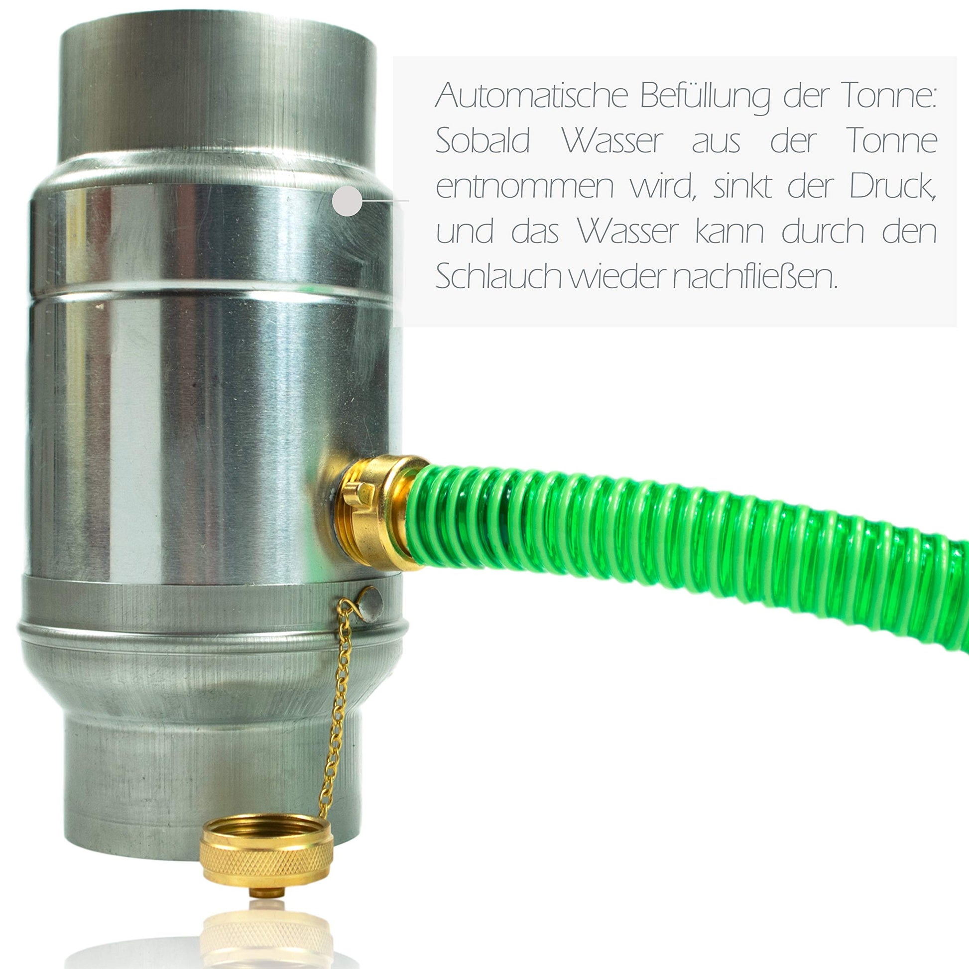 - Automatischer Überlaufstopp: Der clevere Aufbau reguliert den Füllstand Ihrer Regentonne selbstständig. Ist sie voll, fliesst überschüssiges Wasser direkt ins Fallrohr und weiter in die Kanalisation ab.