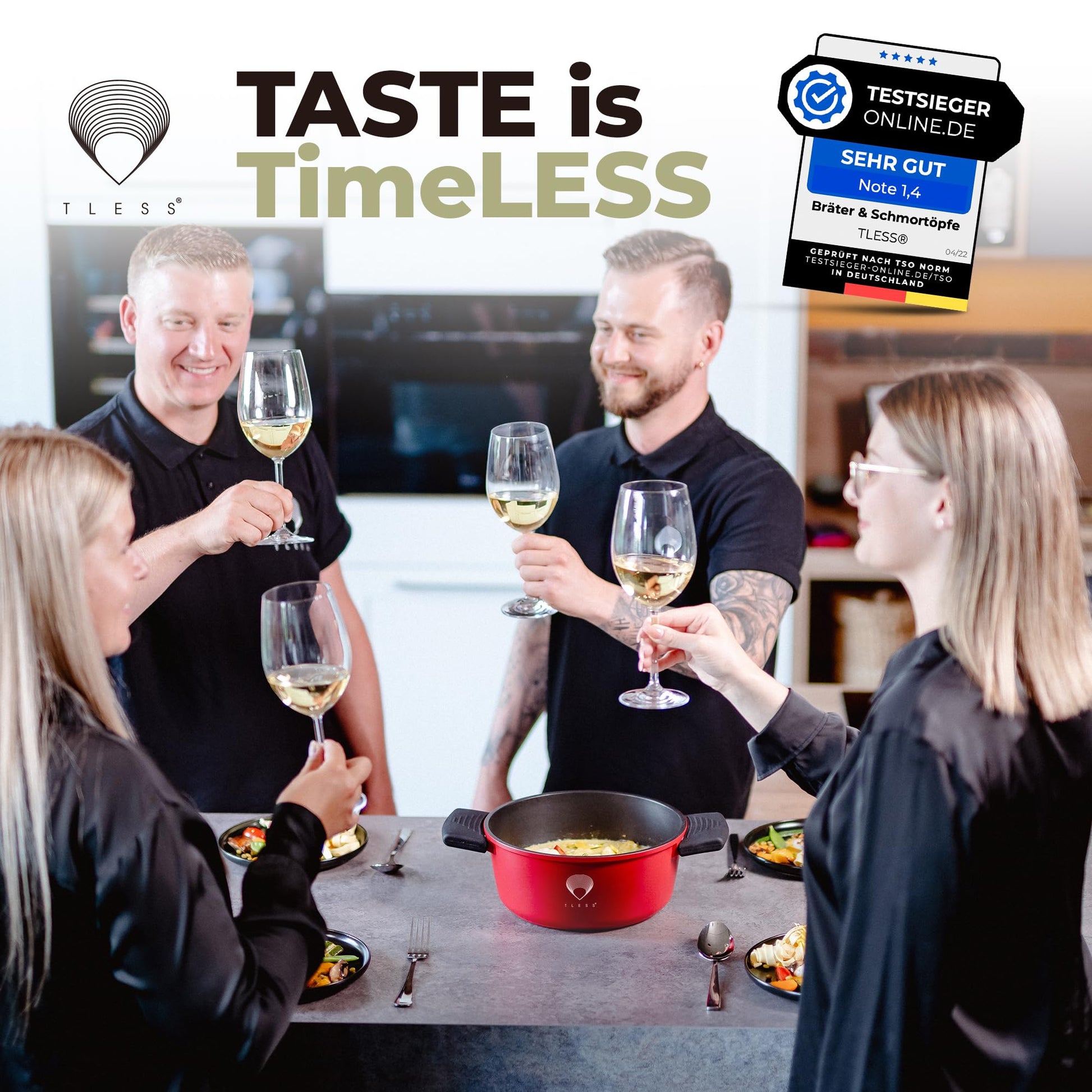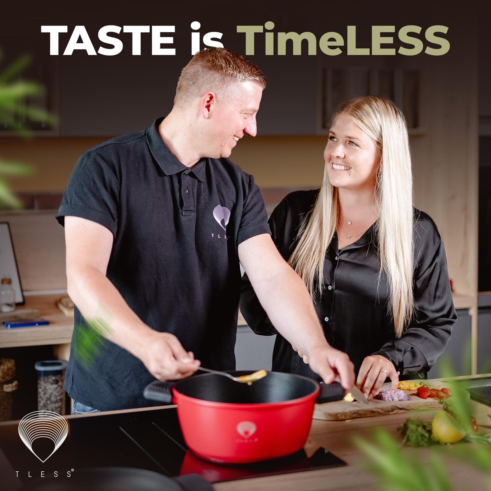 Der TLESS® Bräter ist ein multifunktionaler Allrounder. "2-in-1" bedeutet, dass der Deckel auch separat als Grill- oder Servierpfanne verwendet werden kann. Der grosse Topf (6 Liter) ist ideal zum Kochen, scharfen Anbraten, sanften Schmoren von Braten oder Gulasch und sogar zum Backen von Brot im Ofen.
