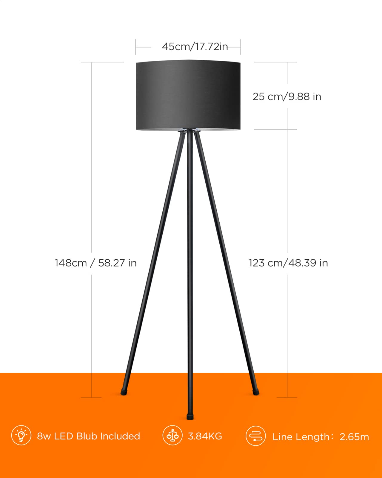 - Inhalt: 1 x Stehlampe, 1 x 8 W LED-Glühbirne (dimmbar), 1 x Kabelklemme, 1 x Bedienungsanleitung