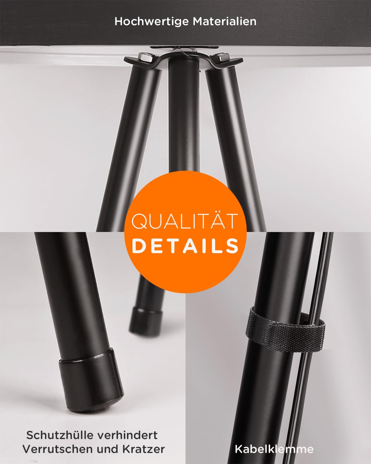 Das Dreibeinstativ aus mattem Metall sorgt für einen sehr stabilen und sicheren Stand. Zusätzlich werden Anti-Rutsch-Hüllen für die Füsse mitgeliefert, die empfindliche Böden wie Parkett oder Laminat zuverlässig vor Kratzern schützen.
