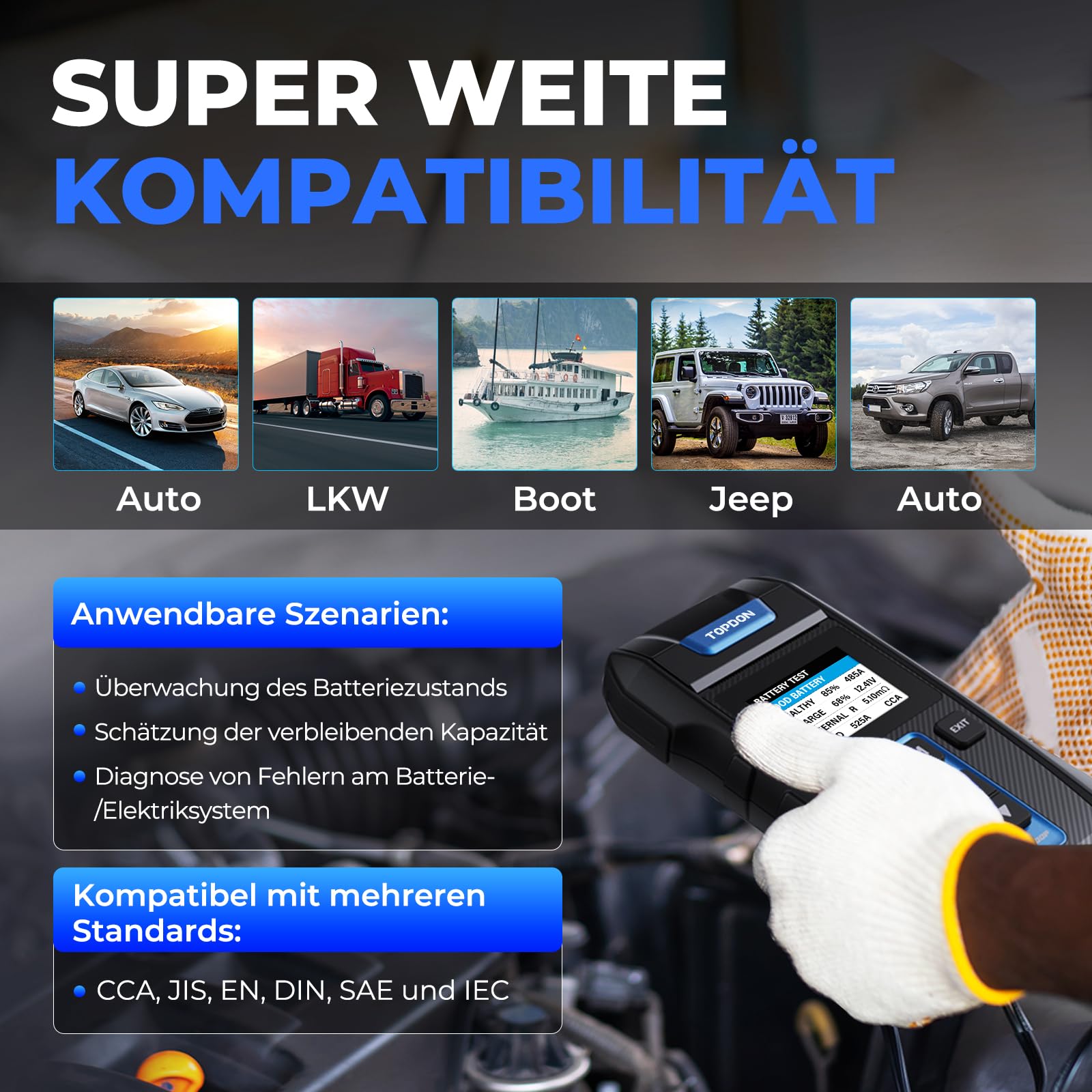 - Umfassende Batterie-Kompatibilität: Testet zuverlässig 12V-Blei-Säure-Batterien (Nass, AGM, GEL, EFB) von 100 bis 2000 CCA und unterstützt alle gängigen Normen (CCA, JIS, EN, DIN, SAE, IEC).