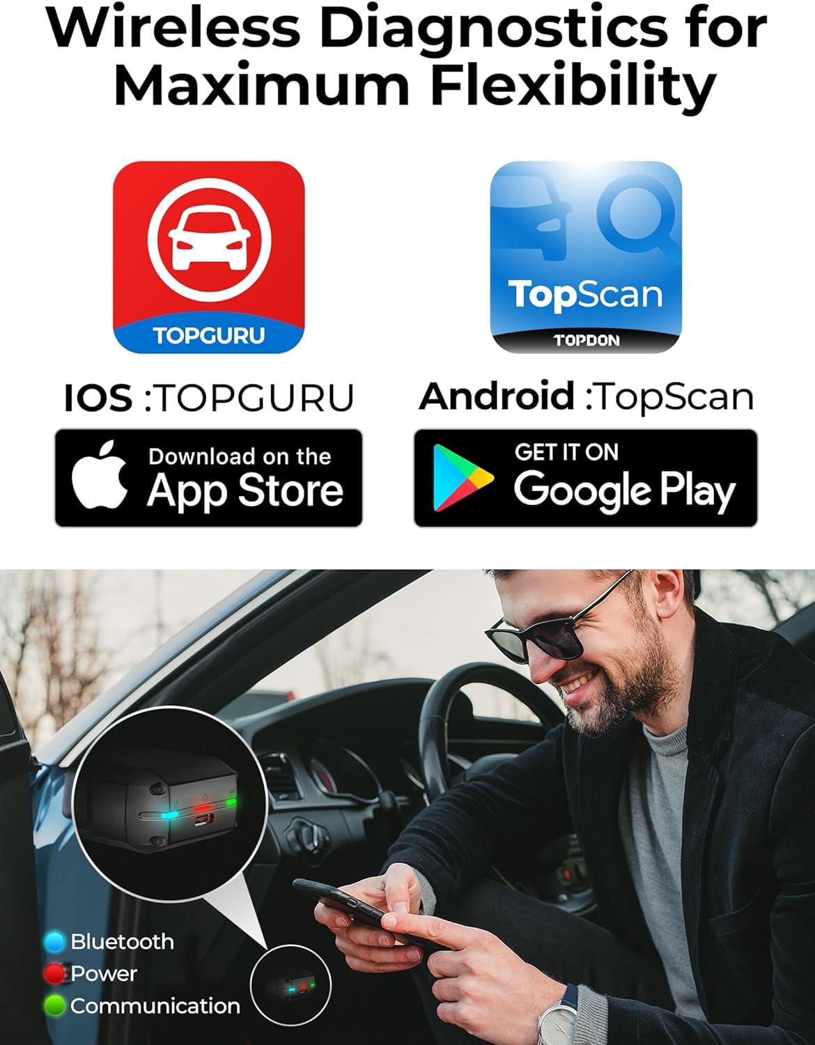 Das TOPDON Topscan verwandelt Ihr Smartphone in ein leistungsstarkes Fahrzeug-Diagnosewerkzeug. Verbinden Sie den Bluetooth-Adapter einfach mit Ihrem Fahrzeug und erhalten Sie umfassende Einblicke in alle Fahrzeugsysteme direkt auf Ihr iPhone oder Android-Gerät.