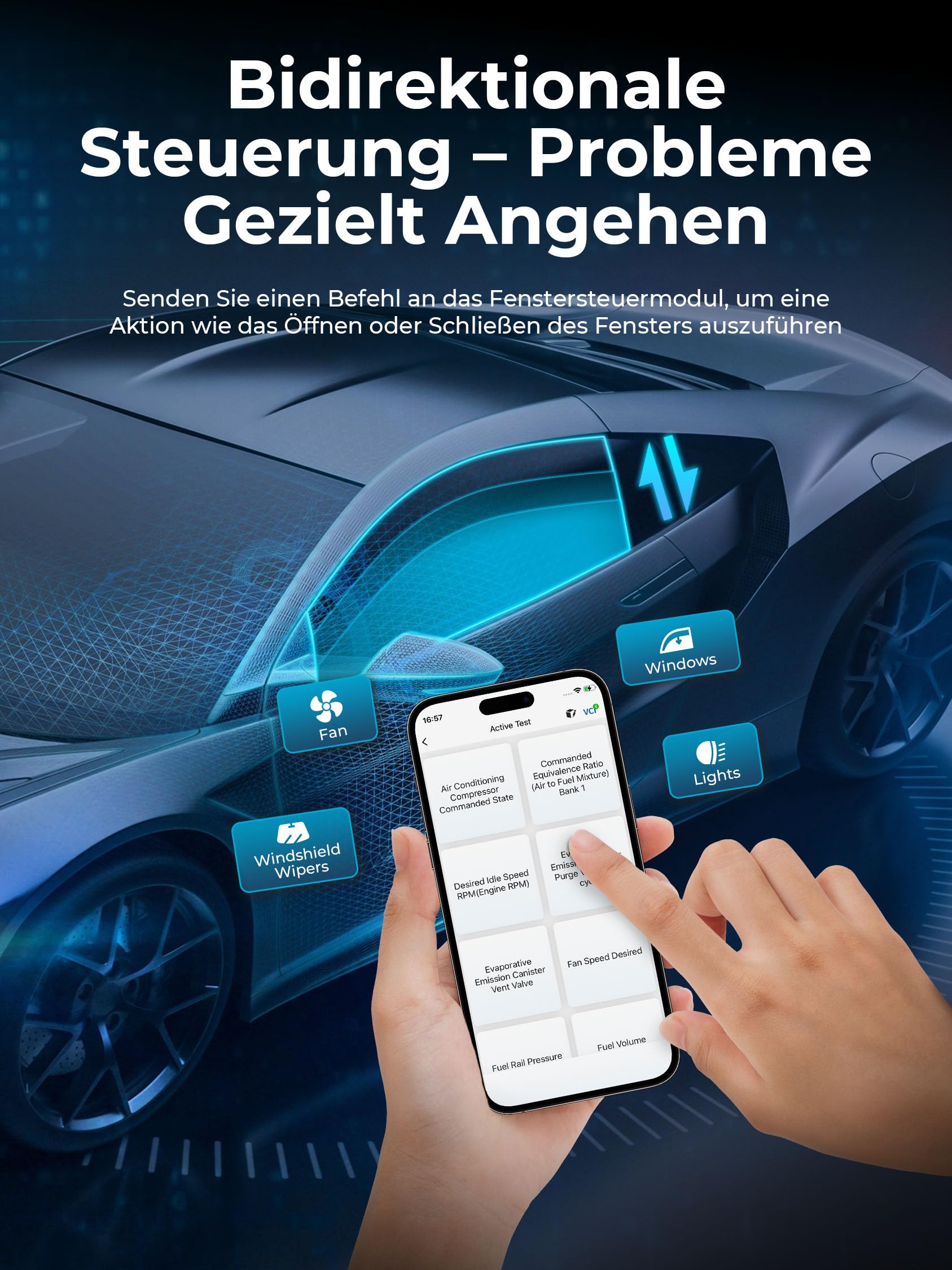 - Aktive Tests (Bidirektionale Steuerung): Senden Sie Befehle direkt vom Smartphone an die Steuergeräte des Fahrzeugs, um Komponenten wie Injektoren, Pumpen oder Fenster zu testen und Probleme schnell zu isolieren.