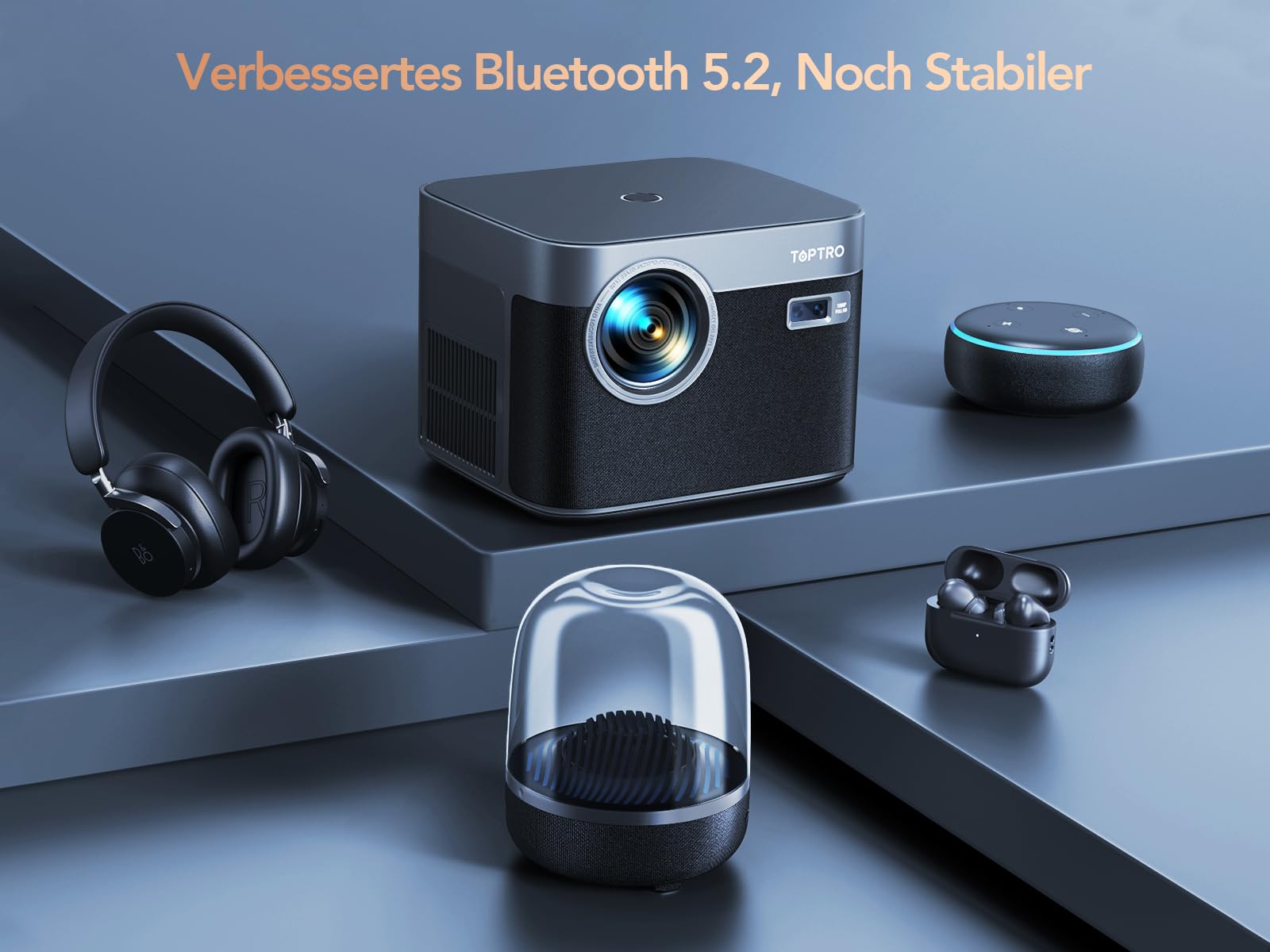 Der Projektor verfügt über integrierte Lautsprecher, unterstützt jedoch kein Dolby-Audioformat. Für ein optimales Klangerlebnis können Sie dank ultraschnellem Bluetooth 5.2 ganz einfach externe Bluetooth-Lautsprecher oder Kopfhörer kabellos verbinden.