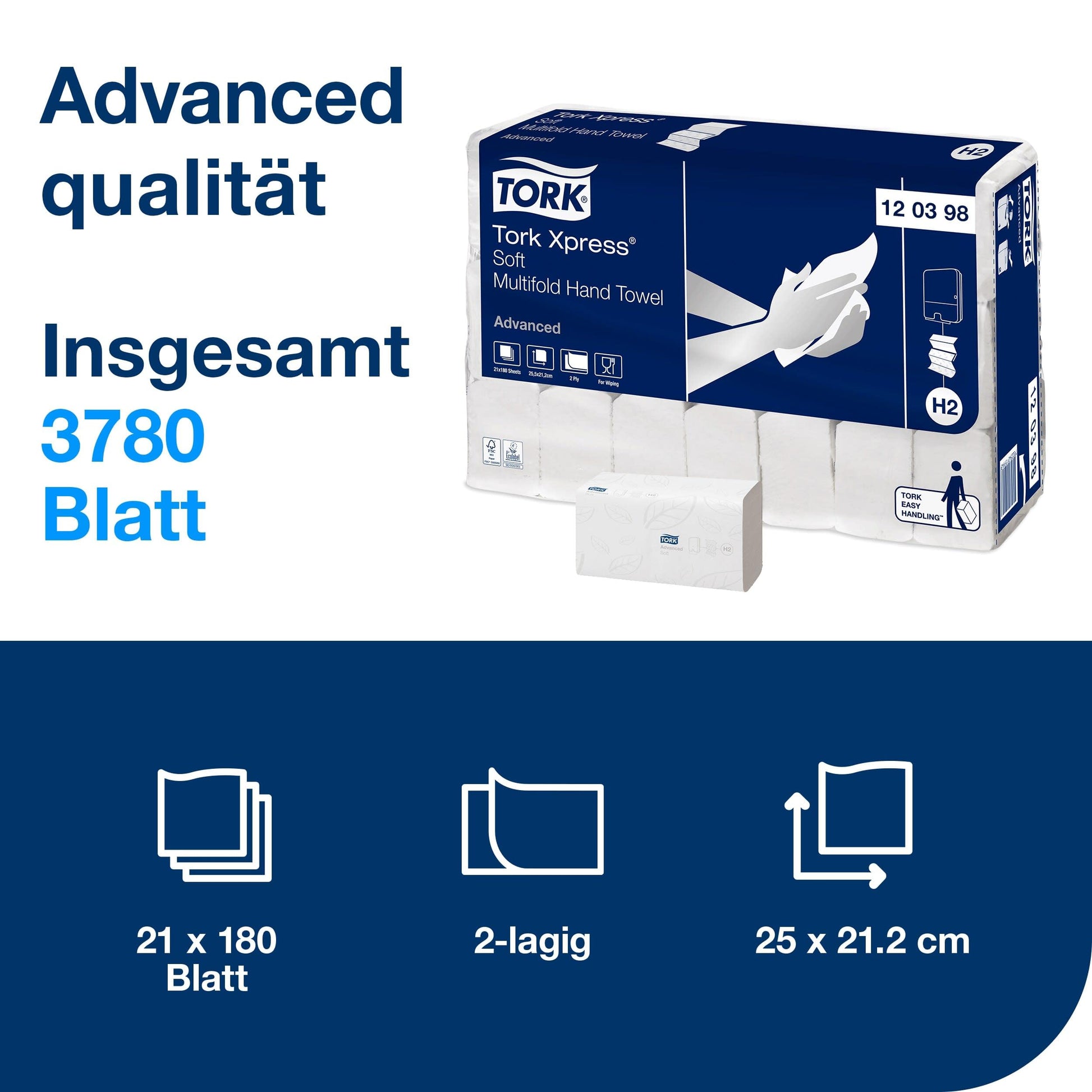 Ein einzelnes Tuch misst entfaltet 25,6 cm x 21,2 cm (gefaltet 8,5 cm x 21,2 cm). Eine Verkaufseinheit enthält 21 Packungen mit je 180 Tüchern, also insgesamt 3.780 Handtücher, passend für alle Tork H2 Spender.
