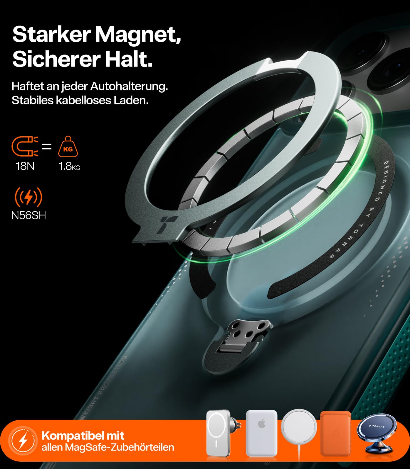 - Starke MagSafe-Kompatibilität: Ein unsichtbarer Ring mit leistungsstarken N56-Magneten und Halbach-Technologie sorgt für eine beeindruckende Haltekraft von 18N – perfekt für schnelles Laden und eine sichere Verbindung mit Autohalterungen.