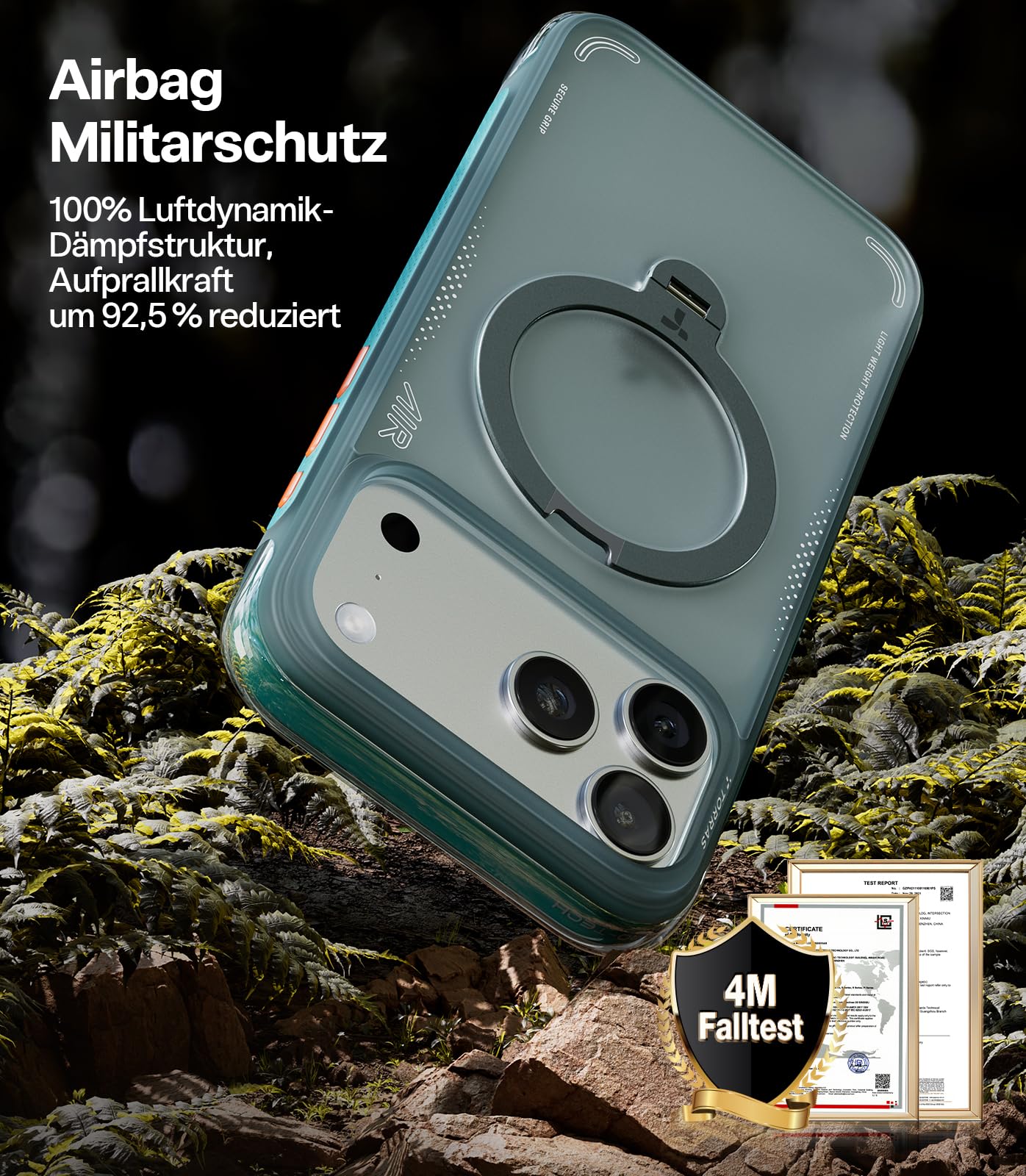 Sie verfügt über einen patentierten Dual-Airbag-Schutz, inspiriert von modernen Laufschuhen, der Stösse mit 100 % Rückprallkraft abfängt. Diese Struktur übertrifft militärische Falltest-Standards und bewahrt Ihr Gerät, wie in über 5'000 Tests bestätigt, zuverlässig vor Schäden.