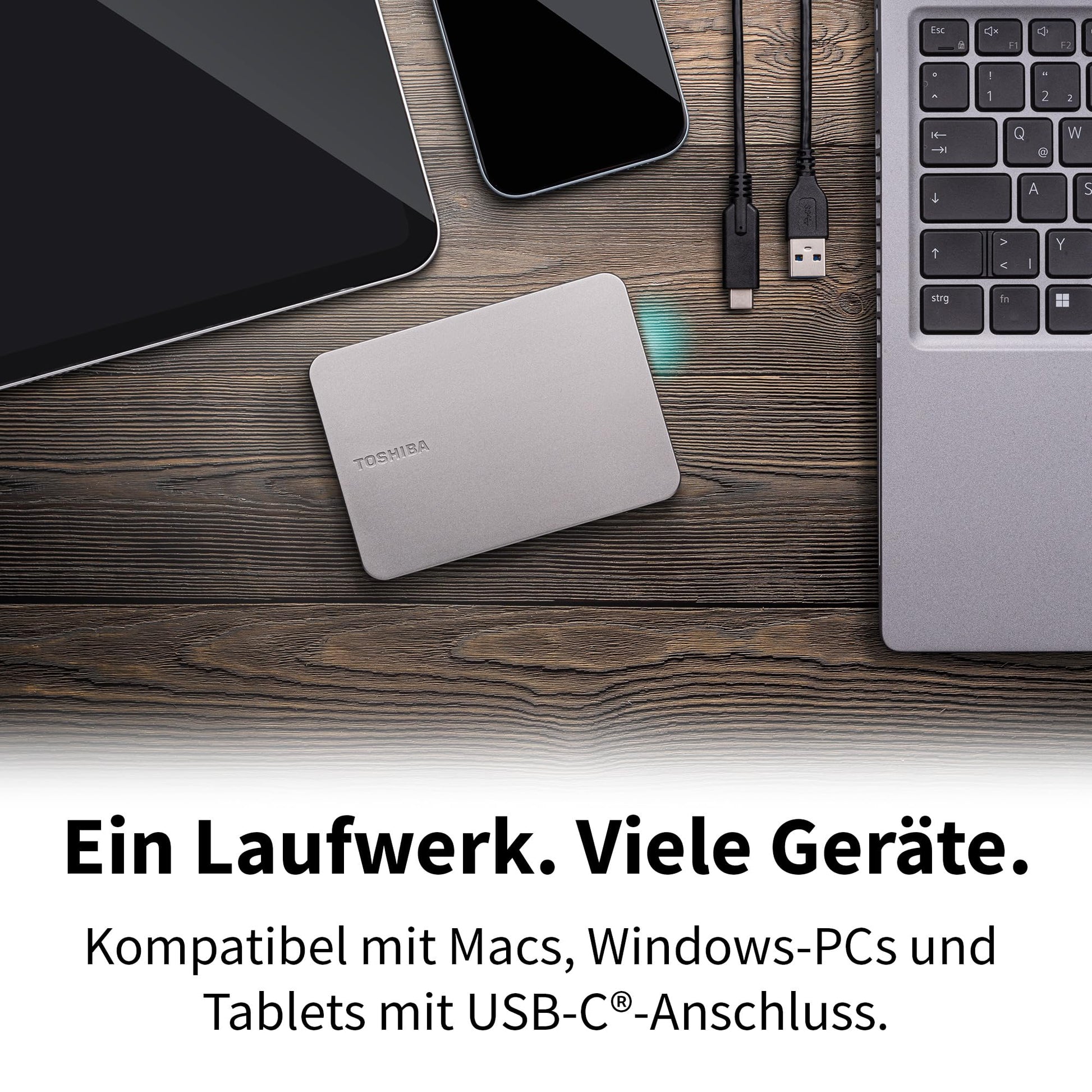 Die Canvio Flex ist für maximale Kompatibilität mit Windows-PCs, Macs, Tablets und Smartphones konzipiert. Dank der Vorformatierung im exFAT-Dateisystem und den mitgelieferten USB-C- sowie USB-A-Kabeln können Sie die Festplatte ohne Neuformatierung nahtlos zwischen verschiedenen Plattformen verwenden.