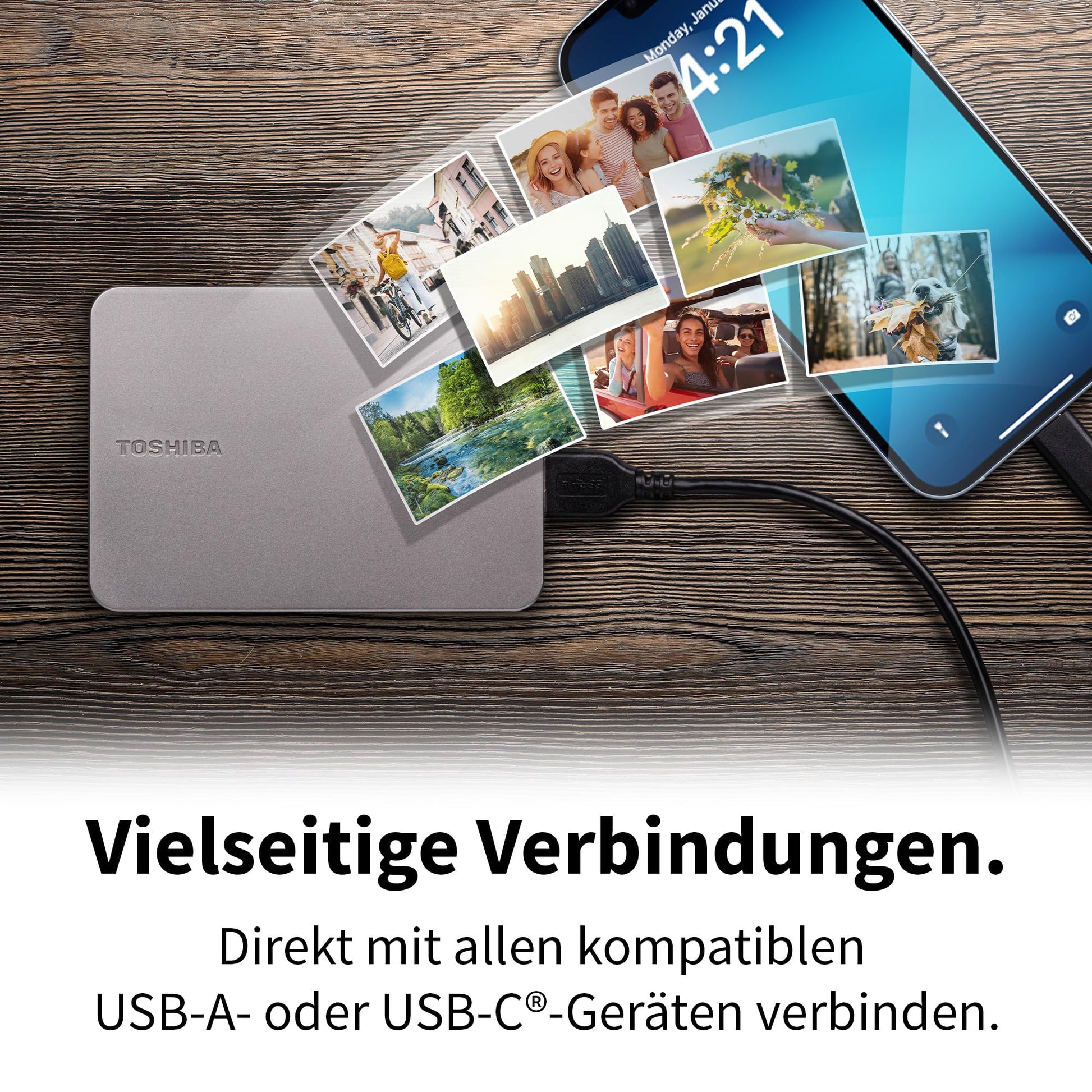 Die Canvio Flex wurde für maximale Kompatibilität entwickelt und agiert als Ihr verlässlicher Partner im digitalen Alltag. Ob Sie an einem Windows-PC, einem Mac, einem Tablet oder einem Smartphone* arbeiten – diese Festplatte passt sich nahtlos Ihrer technischen Umgebung an. Dank der mitgelieferten Kabel verbinden Sie das Gerät mühelos und können sofort auf Ihre wertvollen Daten zugreifen, sie sichern oder auf andere Geräte übertragen.