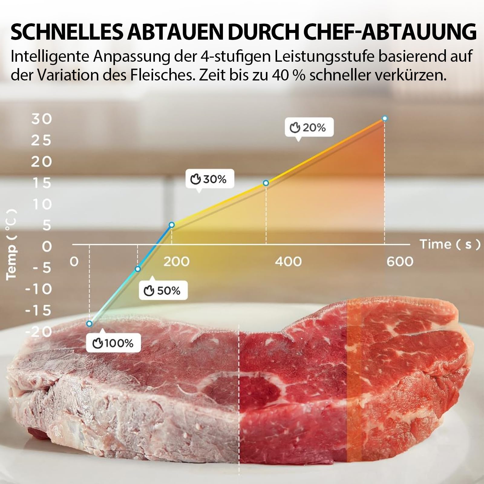 Mit der professionellen «Chef-Abtauung» gehört ungleichmässig aufgetautes Essen der Vergangenheit an. Das Programm steuert die Leistung präzise, um zu verhindern, dass Lebensmittel aussen bereits garen, während sie innen noch gefroren sind. So bleibt die Qualität Ihrer Speisen optimal erhalten.