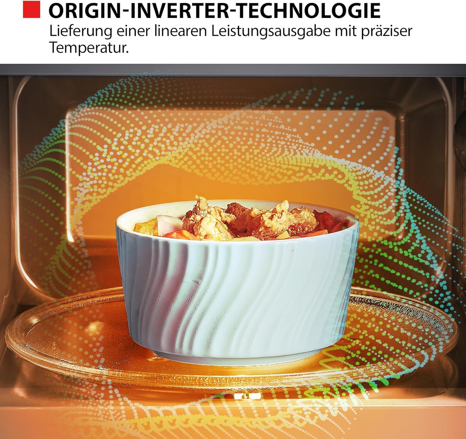 - Leistungsstarke Technik: 900 Watt Mikrowellenleistung dank Origin-Inverter-Technologie und ein kraftvoller 1100 Watt Grill.