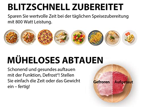 - Fünf flexible Leistungsstufen: Mit einer Mikrowellenleistung von 800 Watt können Sie die Energie präzise anpassen – sei es zum sanften Schmelzen von Butter oder zum schnellen Erhitzen Ihrer Mahlzeiten.