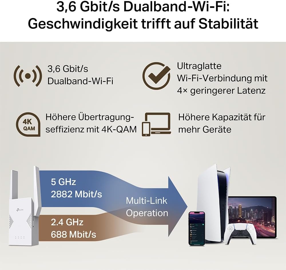 - Wi-Fi 7 der nächsten Generation: Erreicht beeindruckende Geschwindigkeiten von bis zu 3,6 Gbit/s auf zwei Bändern (2882 Mbit/s auf 5 GHz und 688 Mbit/s auf 2,4 GHz) für flüssiges Streaming und Surfen.