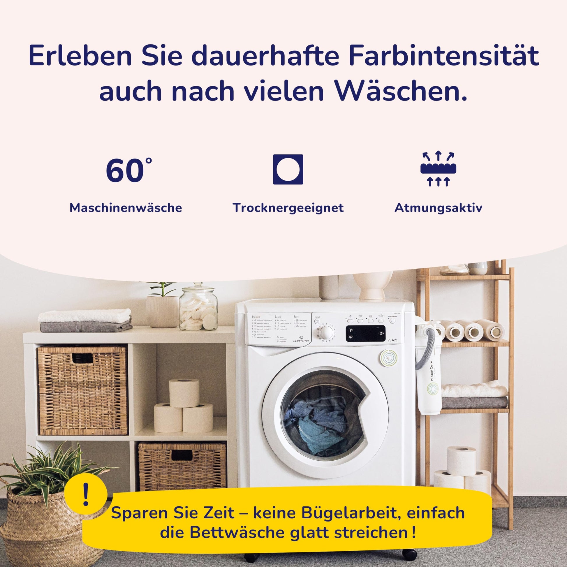 Um die leuchtenden Farben und die flauschige Textur zu erhalten, empfehlen wir, die Bettwäsche vor dem ersten Gebrauch und bei weiteren Wäschen auf links zu ziehen und die Reissverschlüsse zu schliessen. Sie ist maschinenwaschbar bei bis zu 60°C und trocknergeeignet, was sie sehr pflegeleicht macht.