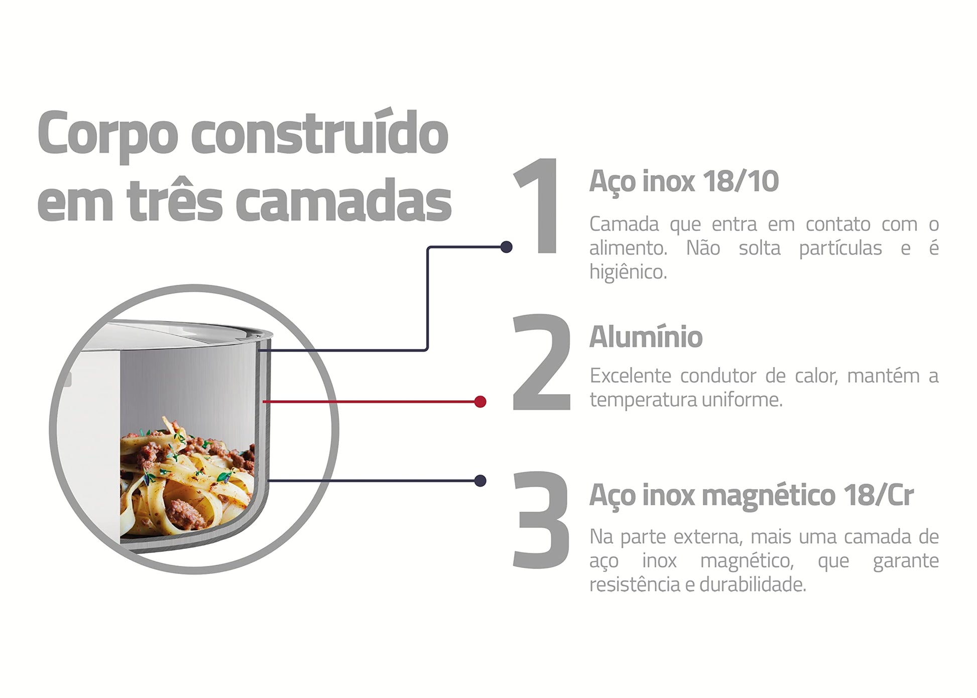 Der innovative dreischichtige Aufbau, bestehend aus einem Aluminiumkern zwischen zwei Edelstahlschichten, garantiert eine aussergewöhnlich schnelle und absolut gleichmässige Hitzeverteilung vom Boden bis zum Rand. Dies sorgt für kontrolliertes und energieeffizientes Kochen ohne Hot-Spots.