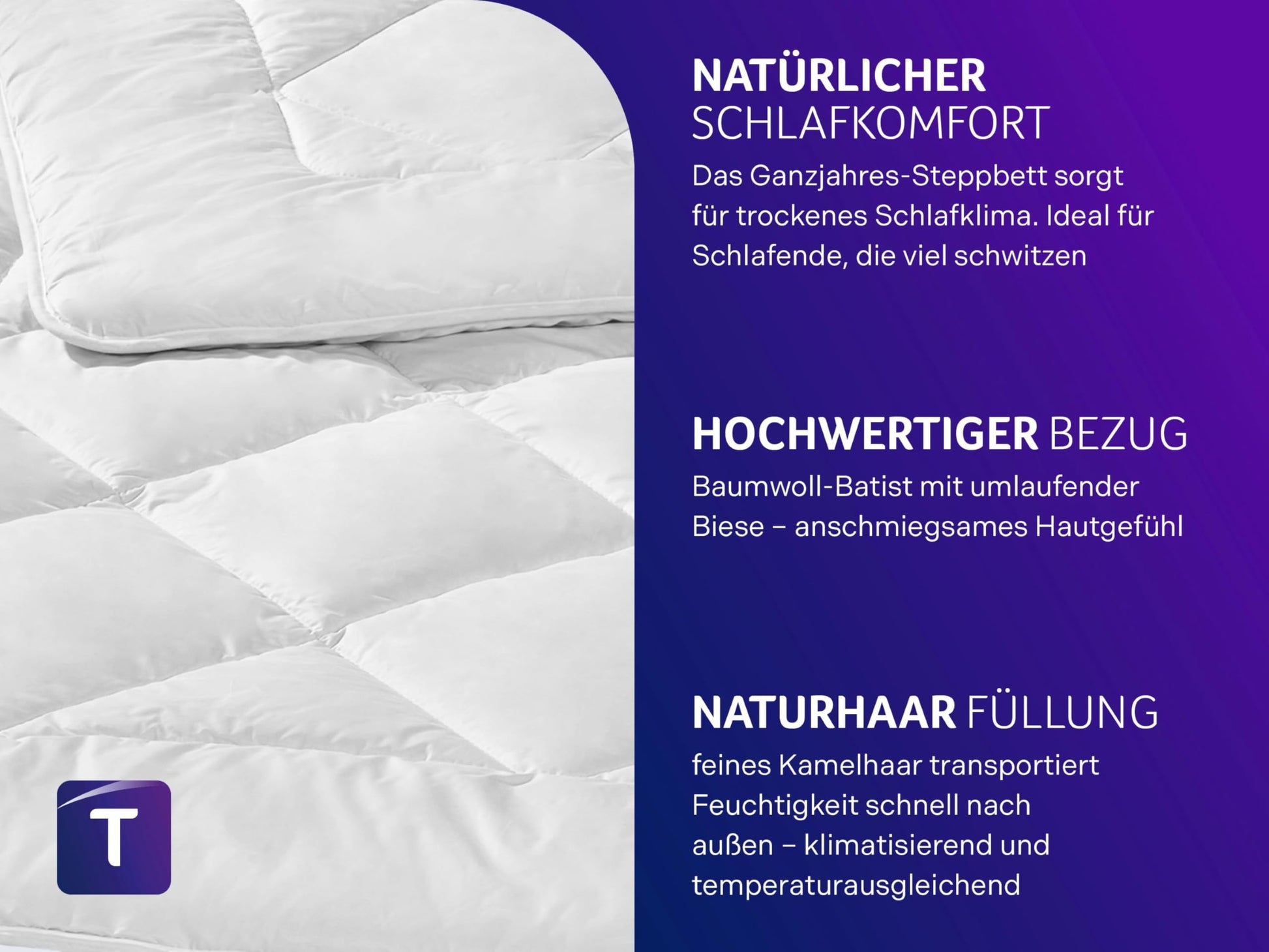 Diese hochwertige Ganzjahresdecke mit einer Füllung aus 100% reinem Kamelhaar bietet Ihnen ein unvergleichlich natürliches und erholsames Schlaferlebnis. Sie wurde nach deutschem Qualitätsstandard entwickelt, um höchsten Ansprüchen gerecht zu werden.