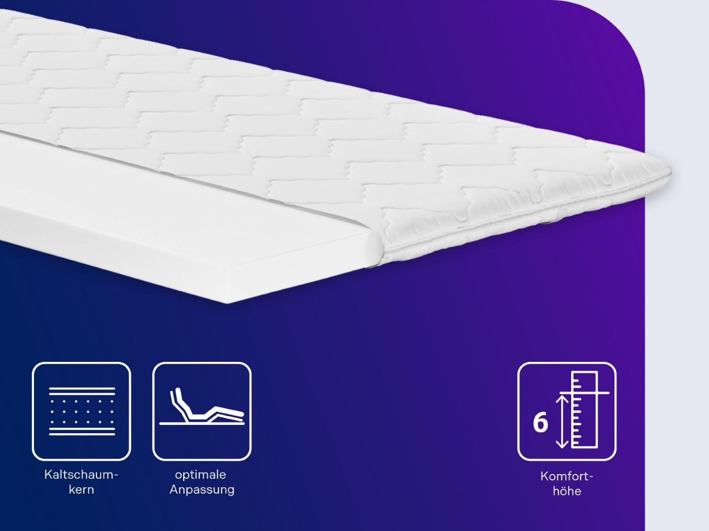 Dieser Topper ist ideal für Personen, die den Komfort ihrer Matratze verbessern und eine ergonomisch korrekte Schlafposition fördern möchten. Der punktelastische Kaltschaumkern stützt den Rücken, passt sich den Körperkonturen an und kann so zur Entlastung und erholsameren Nächten beitragen. Er eignet sich für alle Schlafpositionen.