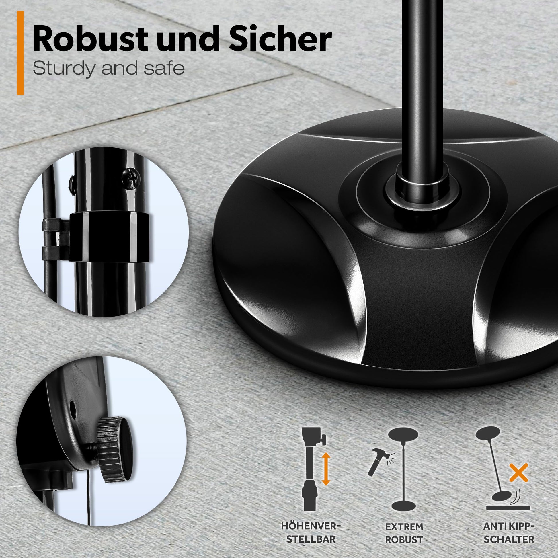 Die Sicherheit steht an erster Stelle: Der Heizstrahler ist nach Schutzart IP34 gegen Spritzwasser geschützt und somit für den Einsatz im Freien wie auch in Innenräumen geeignet. Eine integrierte Kippsicherung schaltet das Gerät sofort ab, falls es umgestossen werden sollte, und der grosse Fuss sorgt jederzeit für einen sicheren Stand.