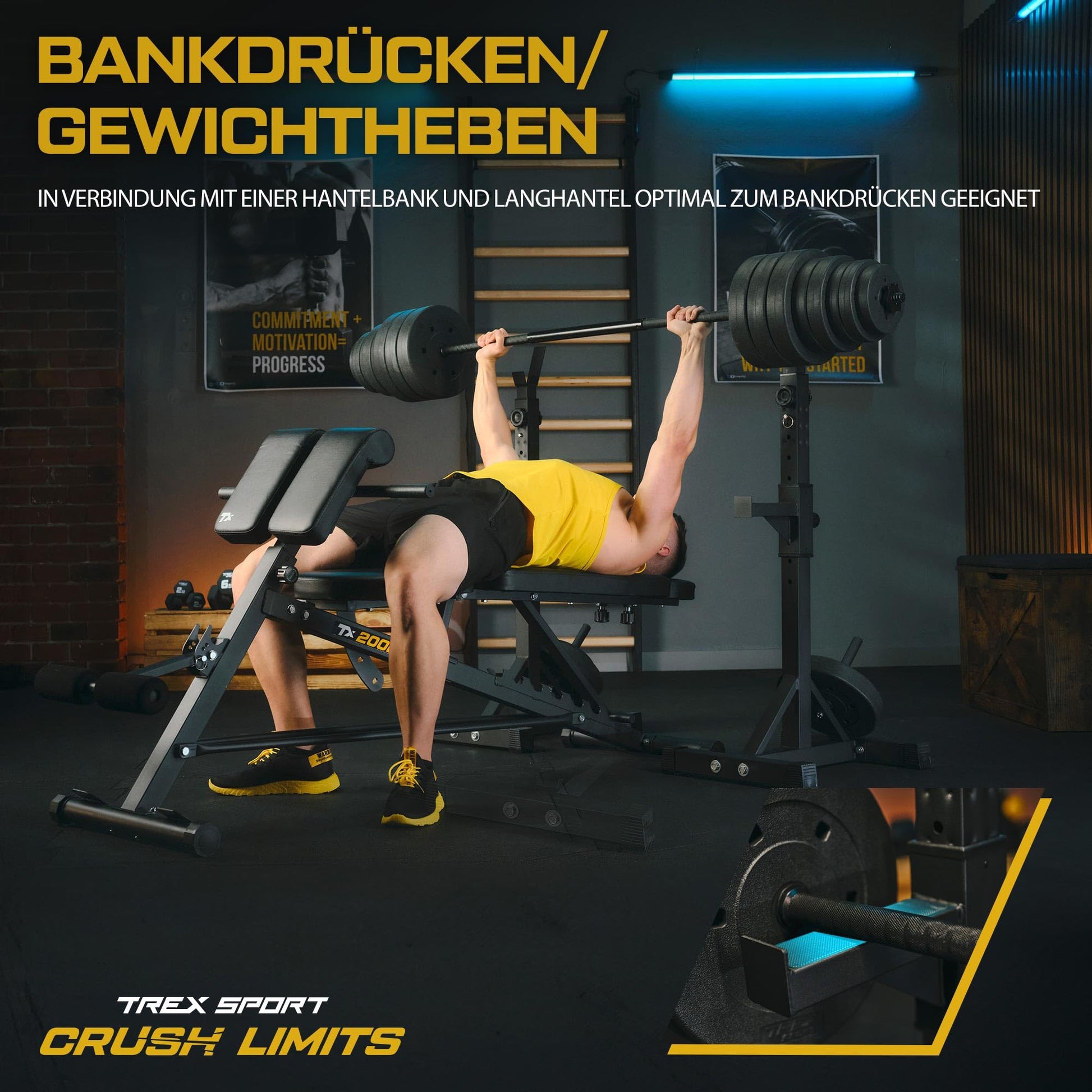 Der TREX SPORT Hantelständer TX-090S ist für ein anspruchsvolles Krafttraining konzipiert und kann mit bis zu 200 kg belastet werden. Er eignet sich ideal für Grundübungen wie Kniebeugen, Bankdrücken in Kombination mit einer Hantelbank und Kreuzheben.