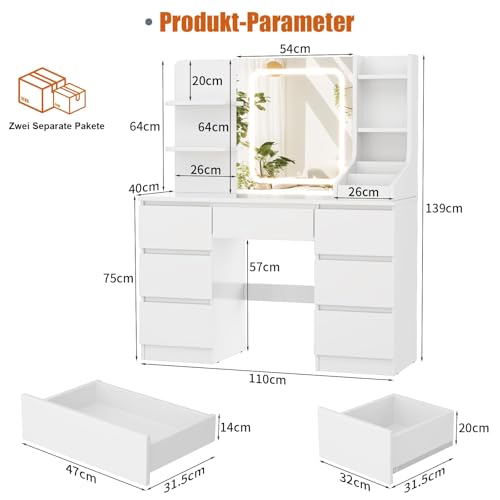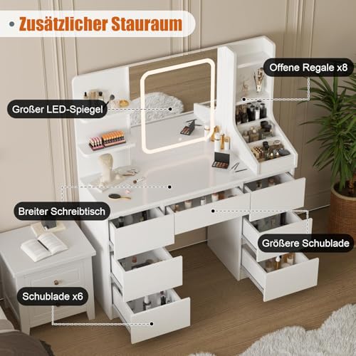 Der Schminktisch bietet grosszügigen Stauraum mit sieben geräumigen Schubladen (insgesamt 141,5 Liter Volumen), vier seitlichen Ablagen und drei offenen Fächern direkt auf der Tischplatte. So bleiben Kosmetik und Accessoires übersichtlich geordnet und griffbereit.