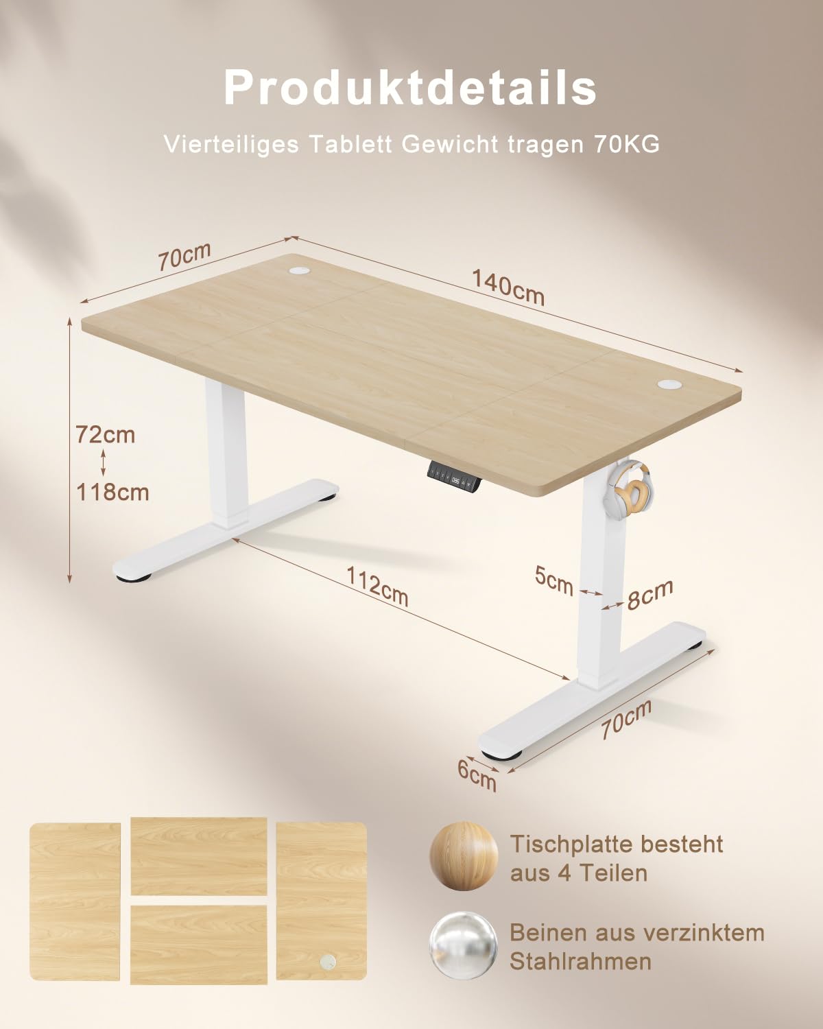 Ja, die grosszügige 140x70 cm Tischplatte und das robuste Stahlgestell sind für eine Tragfähigkeit von bis zu 70 kg ausgelegt, was problemlos für zwei bis drei Monitore und Zubehör ausreicht. Der Motor ist mit unter 50 dB flüsterleise, sodass die Höhenverstellung weder Sie noch Kollegen im Büro stört.