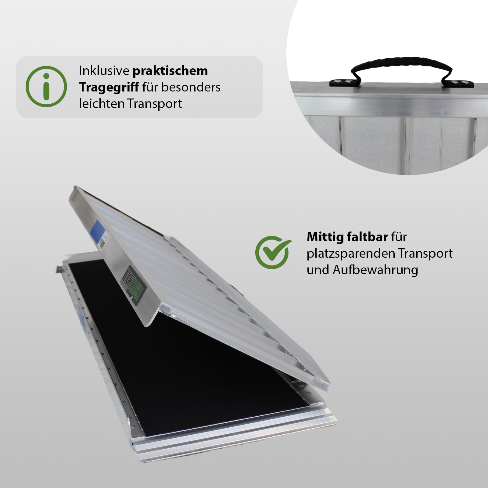 - Praktische Masse: Im ausgeklappten Zustand misst die Rampe 122 cm in der Länge und 73,5 cm in der Breite (inklusive Auflagelippe).