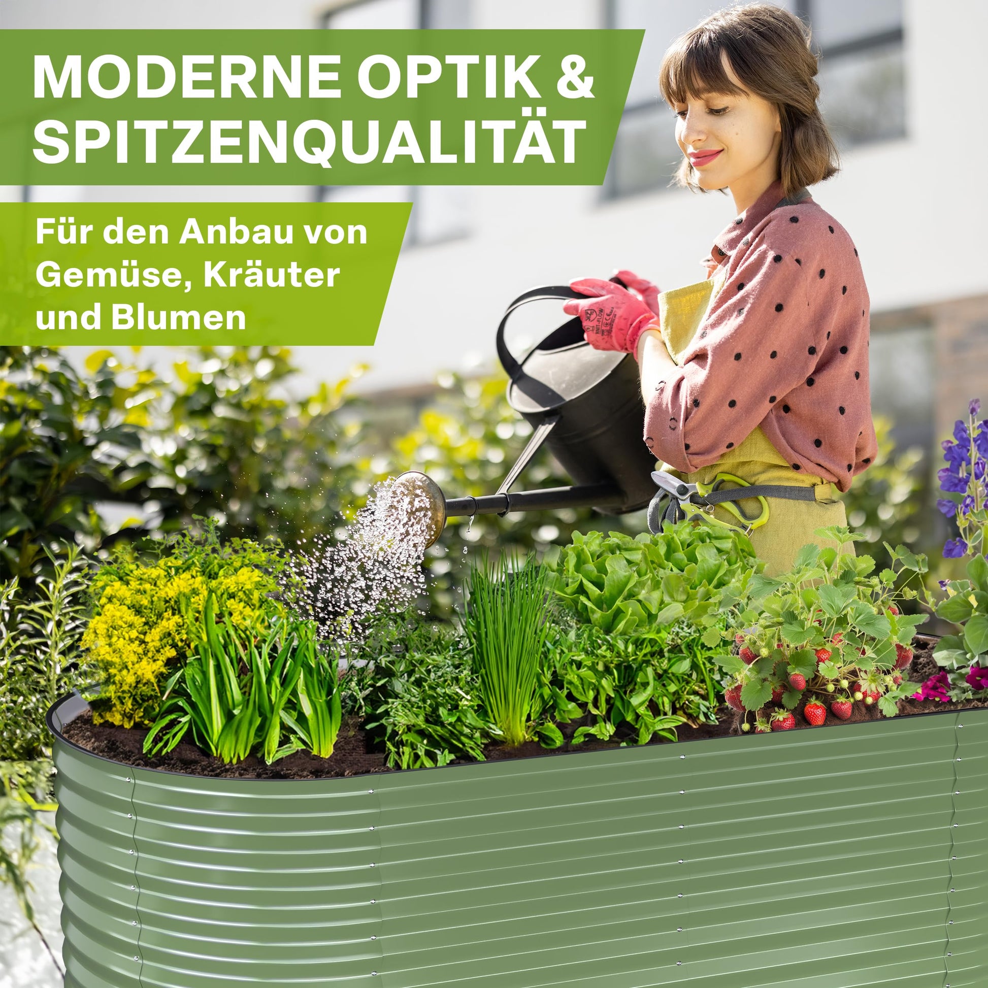 Verwandeln Sie Ihren Garten in eine stilvolle und ertragreiche Oase mit diesem hochwertigen Metall-Hochbeet der Serie «Inspire L». Es verbindet eine elegante, ovale Form mit herausragender Funktionalität und Langlebigkeit für leidenschaftliche Gärtnerinnen und Gärtner.