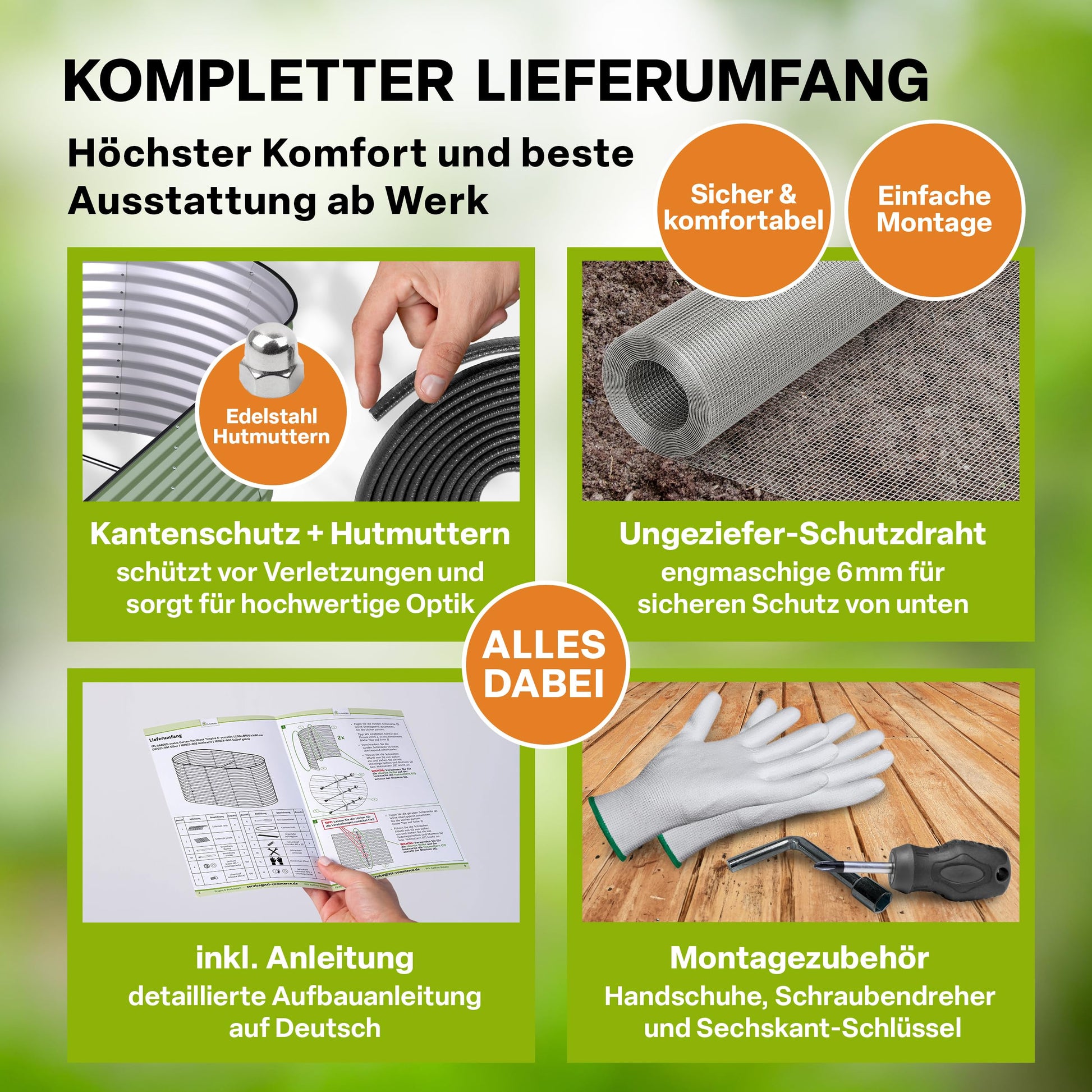 Im Lieferumfang ist alles für den sofortigen Aufbau enthalten: die Stahlteile, hochwertige Edelstahlschrauben, ein oberer Kantenschutz, zwei Rollen Ungeziefer-Drahtgitter für den Boden sowie eine deutsche Anleitung. Für maximale Stabilität sorgen drei robuste Innen-Verstrebungen, die dem Beet einen festen und sicheren Stand verleihen.