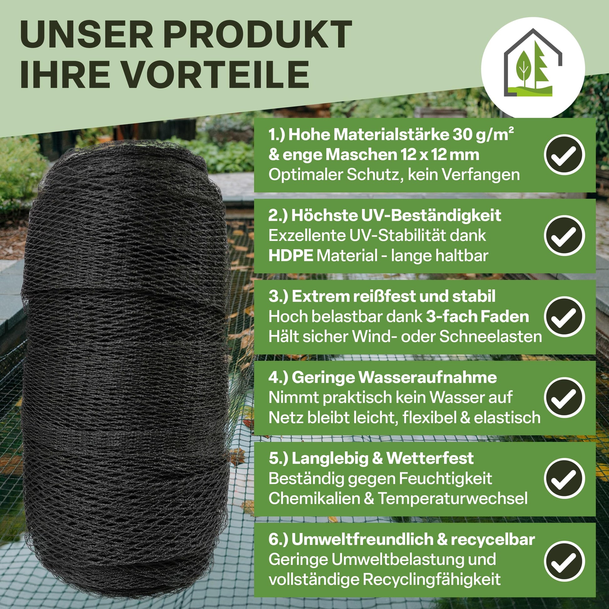 Das Netz misst grosszügige 15 x 15 Meter bei einer engen Maschenweite von 12 x 12 mm. Es besteht aus extra starkem, 3-fach gewebtem HDPE-Polyethylen (30 g/m²), was es extrem reissfest, langlebig sowie witterungs- und UV-beständig macht.