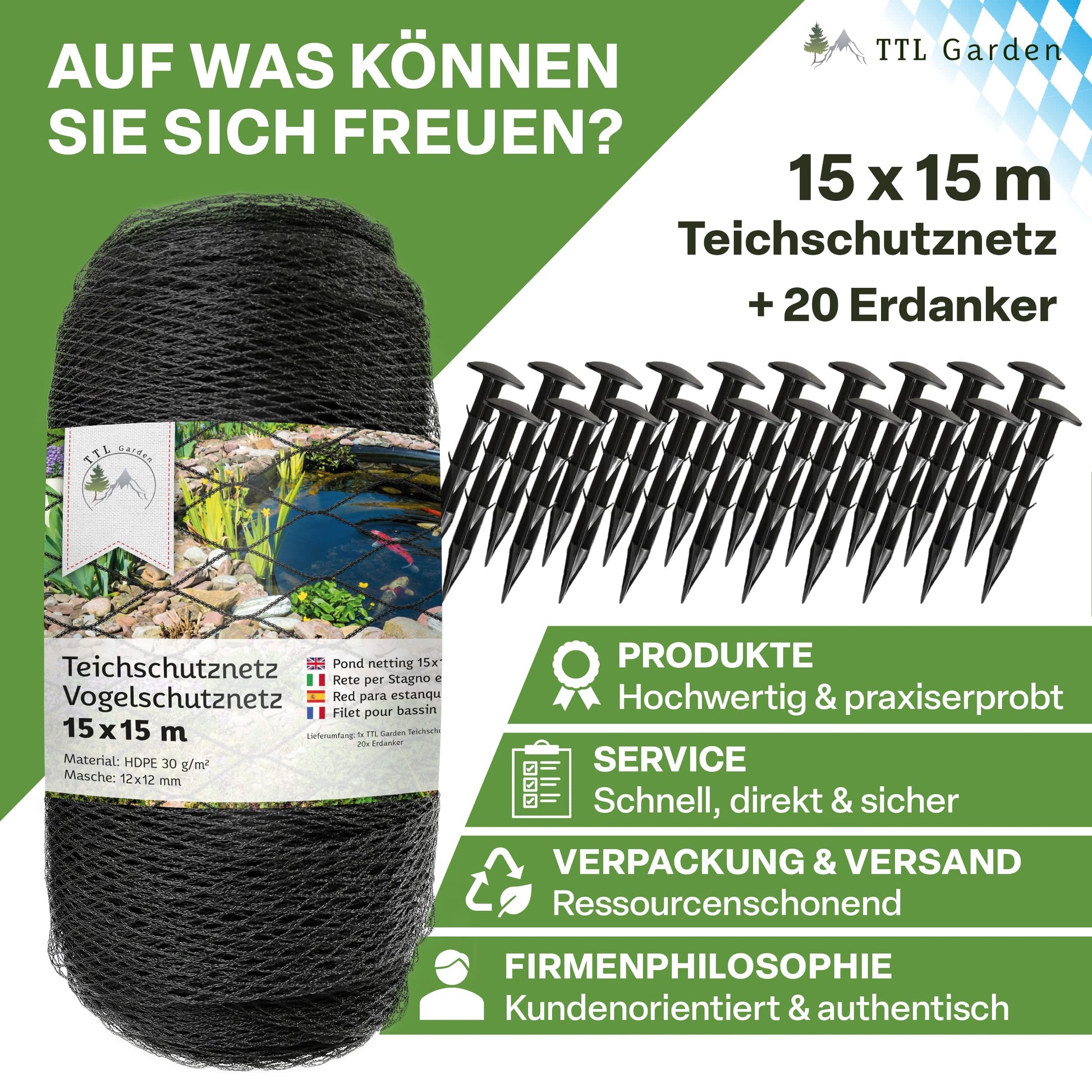 TTL Garden Teichnetz Vogelschutznetz - 15x15m Schwarz 12x12mm