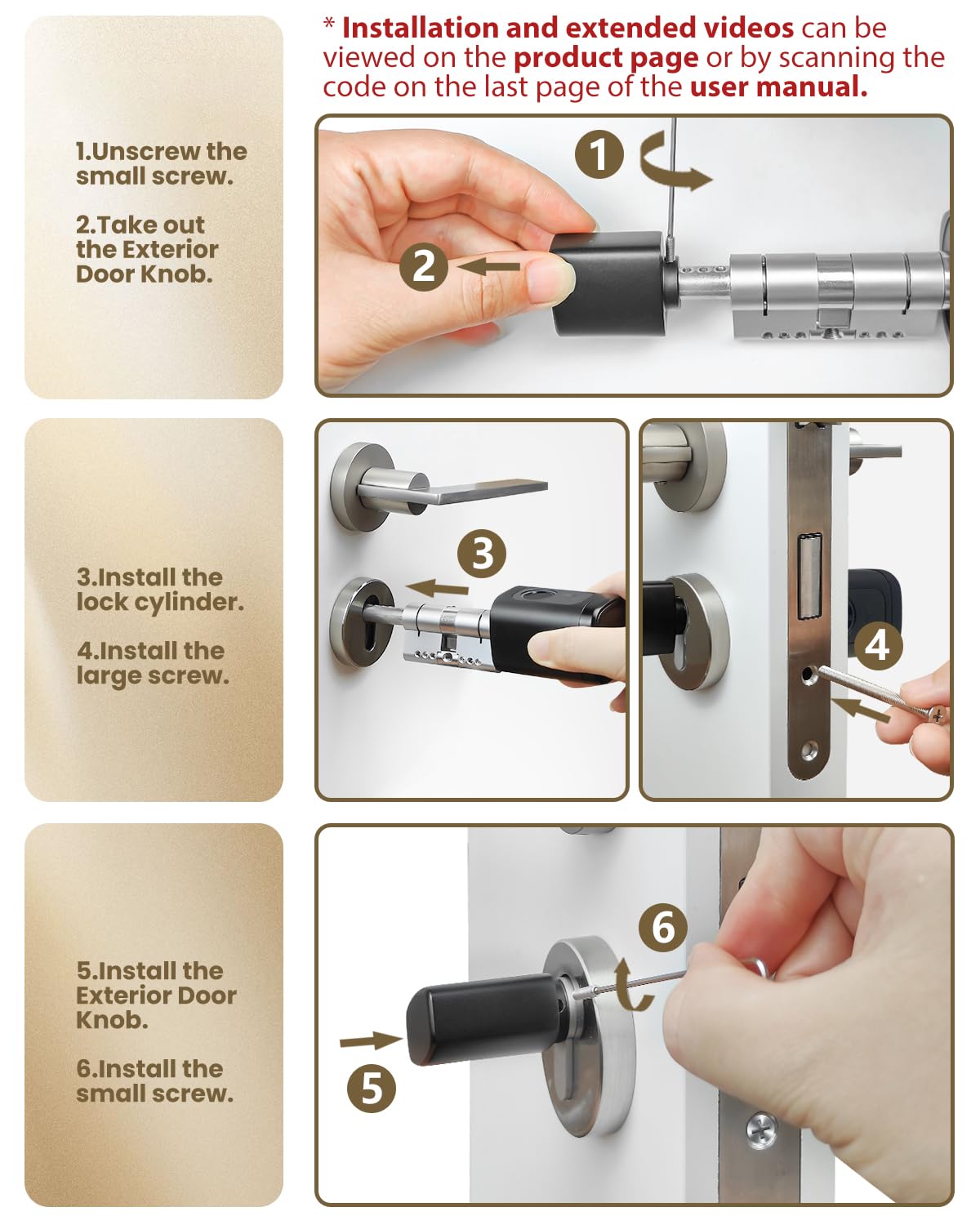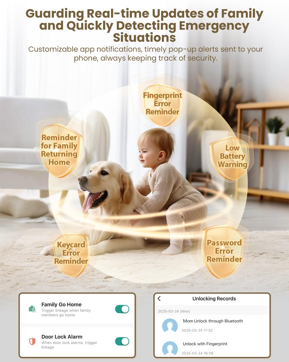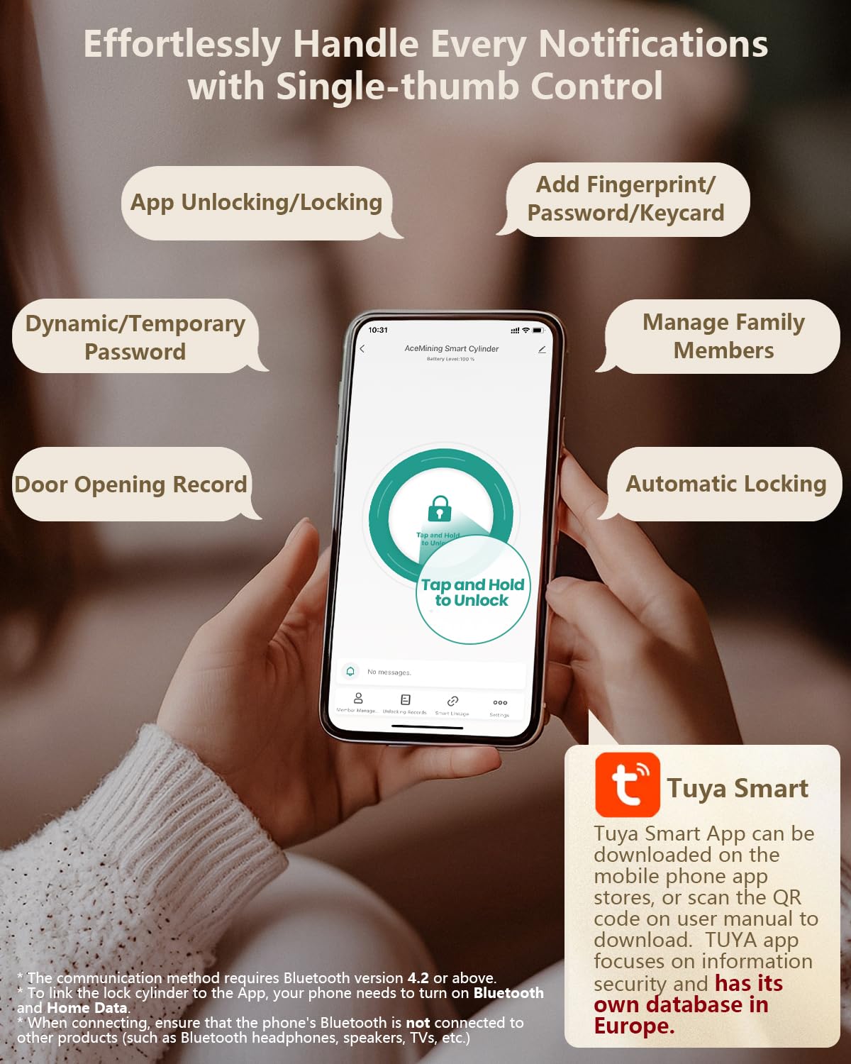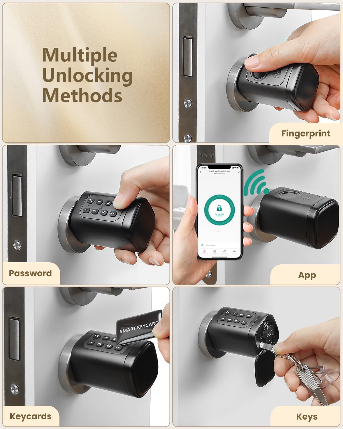 Dieses Smart Lock bietet Ihnen maximale Flexibilität mit fünf verschiedenen Entsperrmethoden. Sie können die Tür bequem per Fingerabdruck, einem individuellen Passwort, der Smartphone-App, einer Schlüsselkarte oder mit dem mechanischen Notschlüssel öffnen – ideal für Familien, Gäste oder Mieter.