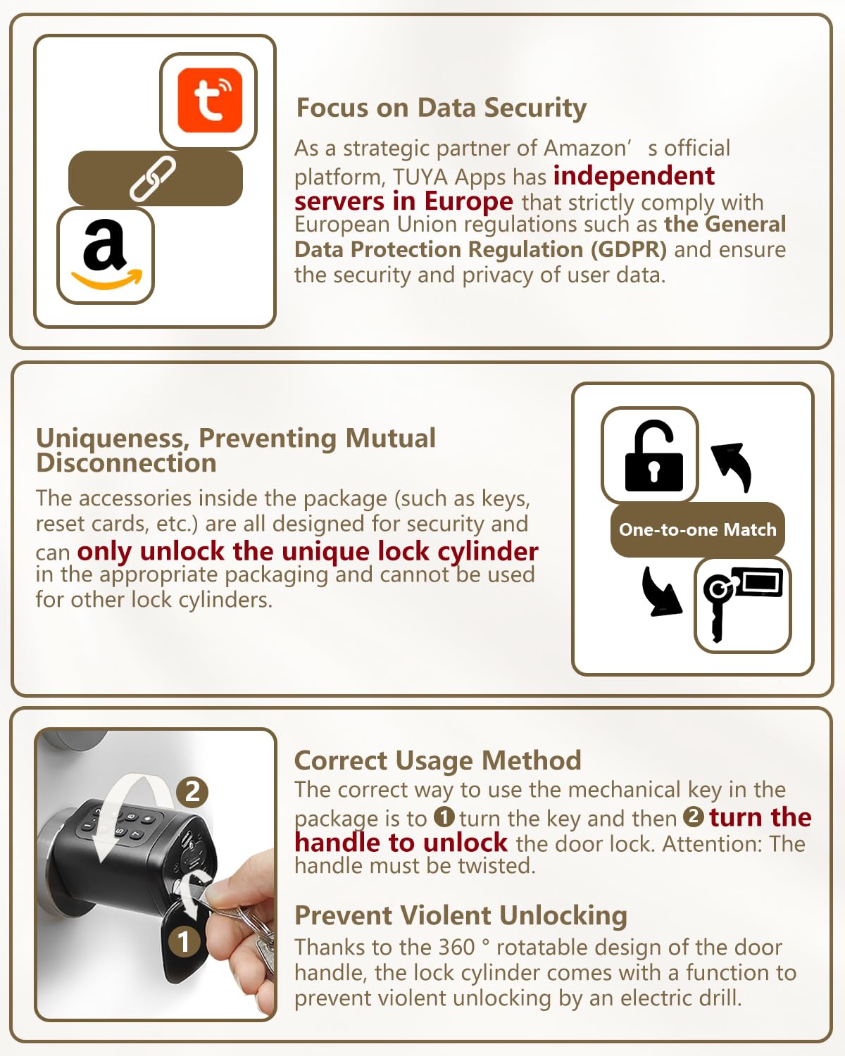 - DSGVO-konforme Datensicherheit: Die Anbindung über die TUYA App erfolgt über unabhängige Server in Europa, die streng nach den europäischen Datenschutzrichtlinien (DSGVO) arbeiten und so Ihre Daten schützen.