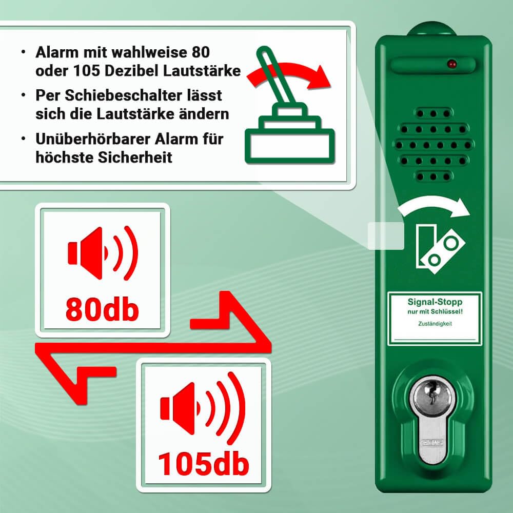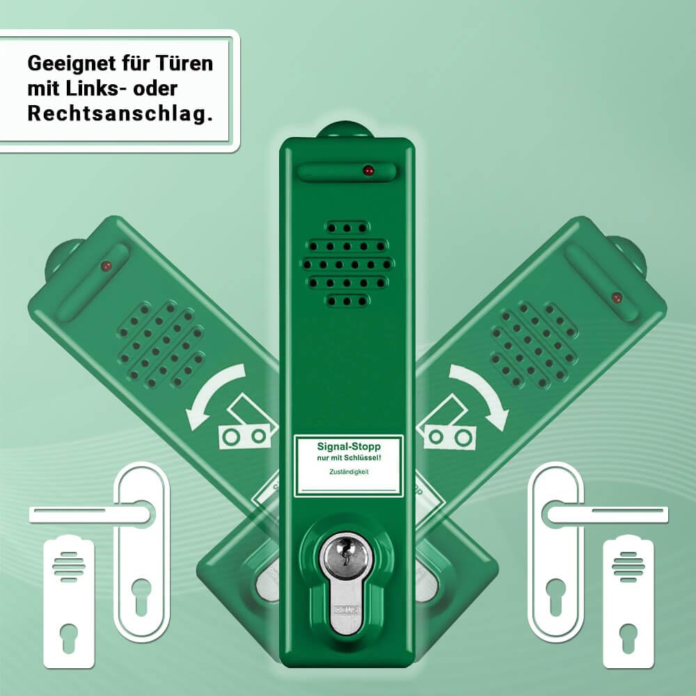 Dieser Türwächter ist speziell zur Sicherung von Flucht-, Brand- und Rettungstüren konzipiert. Er wird unter dem Türdrücker montiert und verhindert die unbefugte Nutzung, indem er beim Herunterdrücken der Klinke einen lauten, abschreckenden Alarm von wahlweise 80 dB oder 105 dB auslöst.
