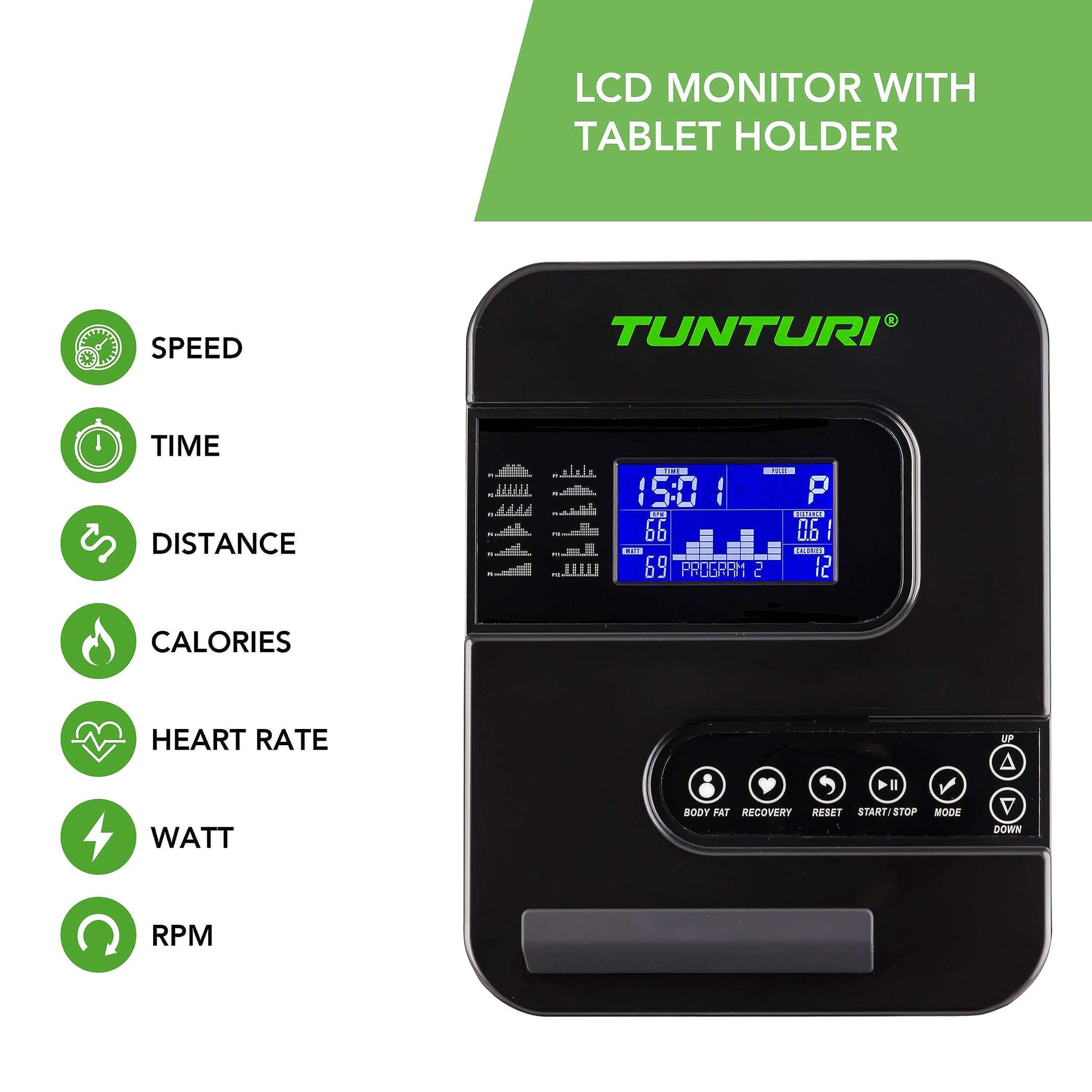 Der übersichtliche LCD-Monitor zeigt alle wichtigen Daten: Geschwindigkeit, Zeit, Distanz, Kalorien, Puls (über Handsensoren), Erholung, Körperfett, RPM und Watt. Eine integrierte Tablethalterung ermöglicht es Ihnen zudem, Ihr Gerät bequem zur Unterhaltung während des Trainings zu nutzen.
