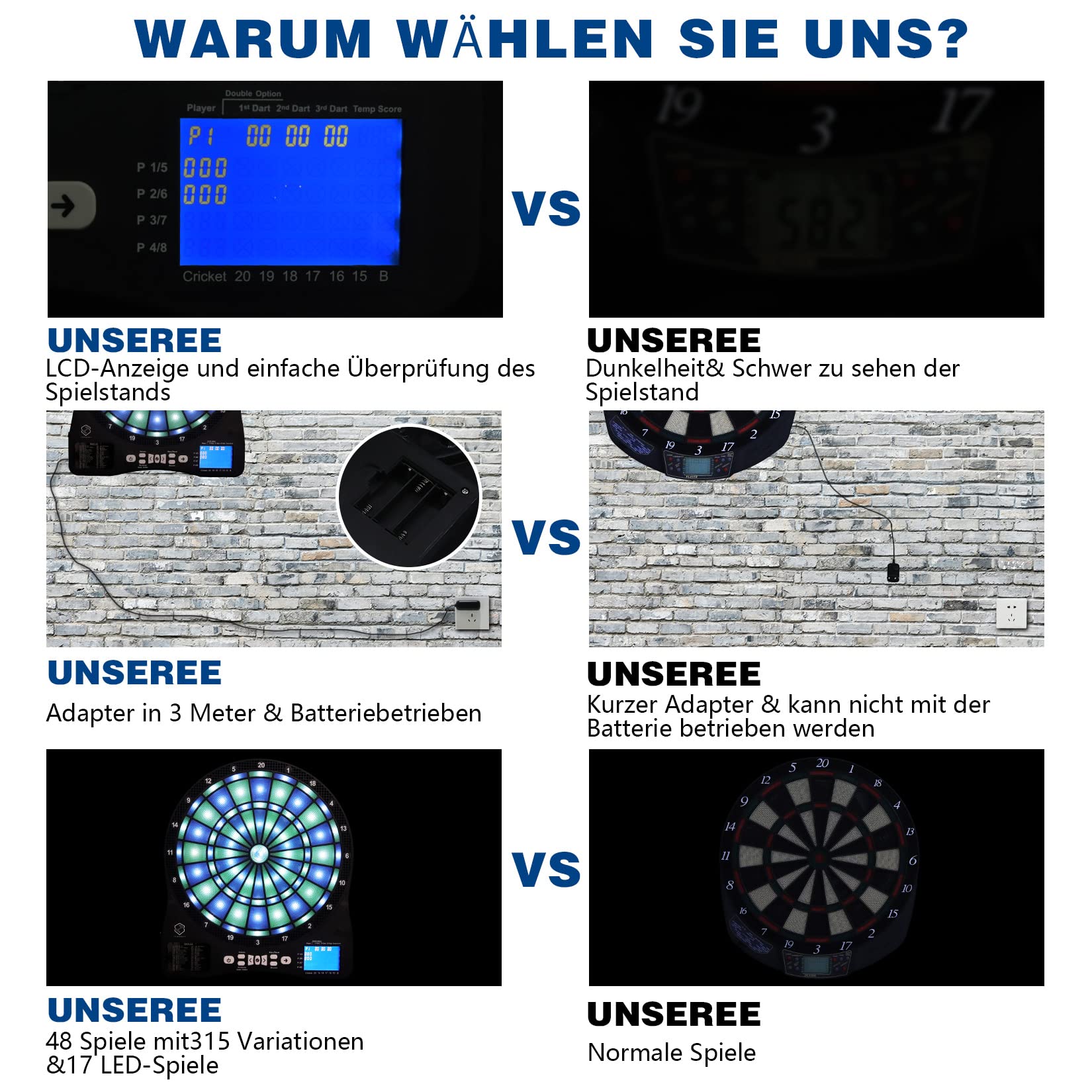 - Benutzerfreundliche Bedienung: Die Dartscheibe verfügt über ein intuitives Bedienfeld und ein übersichtliches LCD-Display, das automatisch die Punkte zählt und den Spielstand anzeigt.