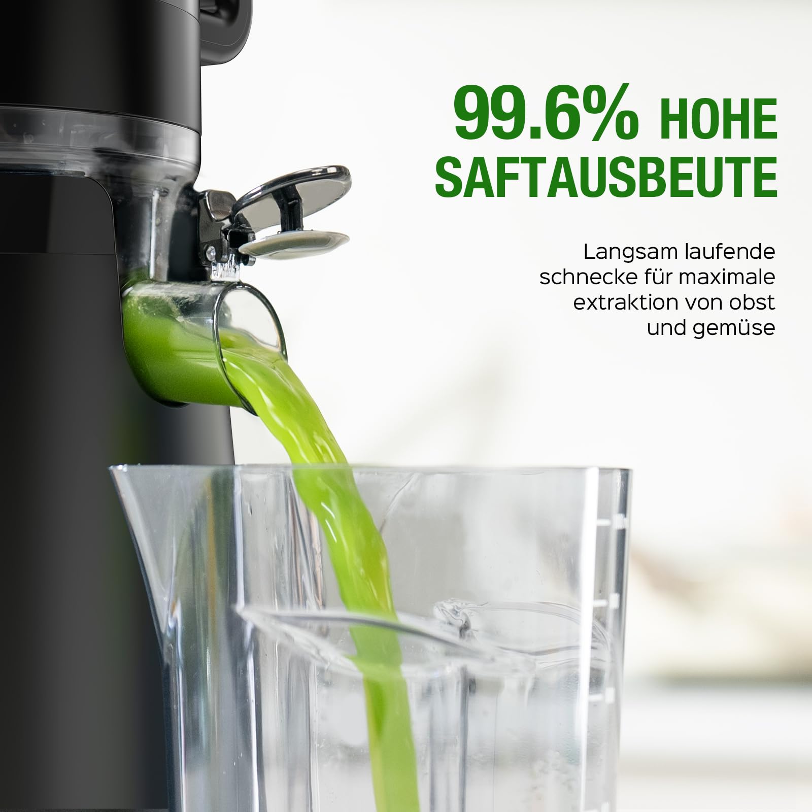 - Schonende Kaltpress-Technologie: Ein 300-Watt-Motor betreibt den Entsafter mit langsamen 43 Umdrehungen pro Minute, was eine maximale Saft- und Nährstoffausbeute sicherstellt.
