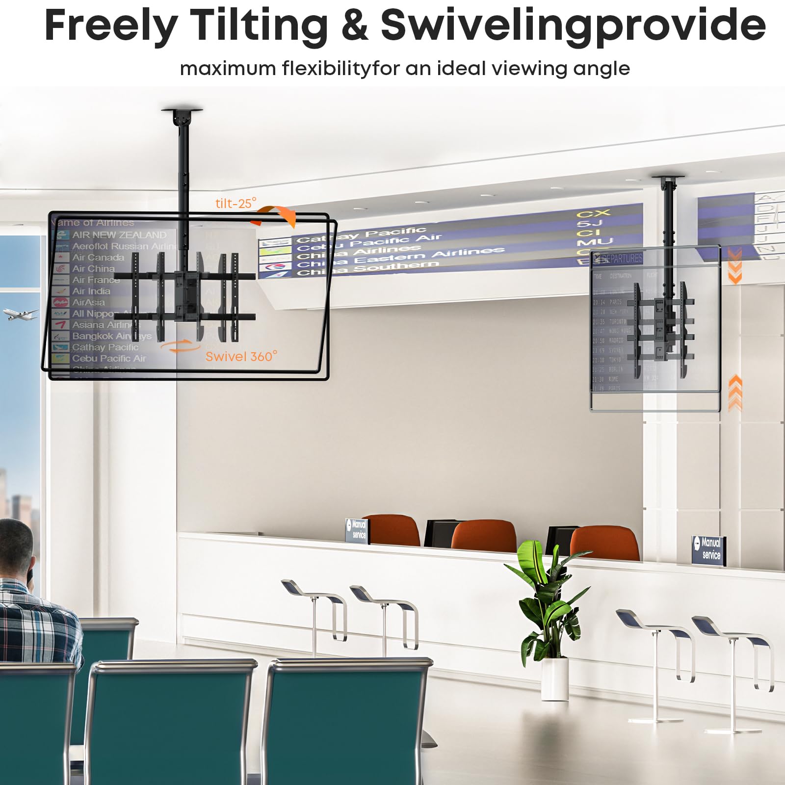 Die Halterung bietet volle Beweglichkeit. Sie können den Fernseher um 360° schwenken, bis zu 25° nach unten neigen, um den perfekten Blickwinkel zu finden, und die Höhe flexibel zwischen 485 mm und 925 mm von der Decke einstellen.