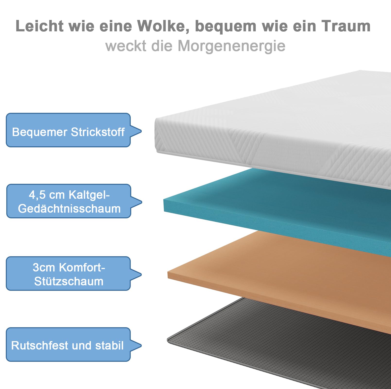 - Zwei-Schichten-System: Eine innovative Kombination aus einer anpassungsfähigen Memory-Schaum-Schicht und einer stabilisierenden Stützschicht.