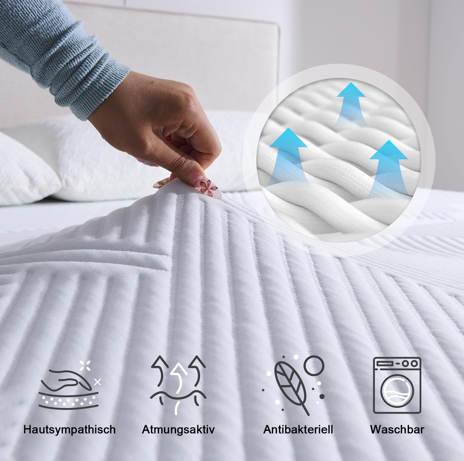 - Atmungsaktiver Bezug: Hochwertiges, weiches Gestrick mit eingearbeiteten Gel-Partikeln, das antiallergische und antibakterielle Eigenschaften besitzt.