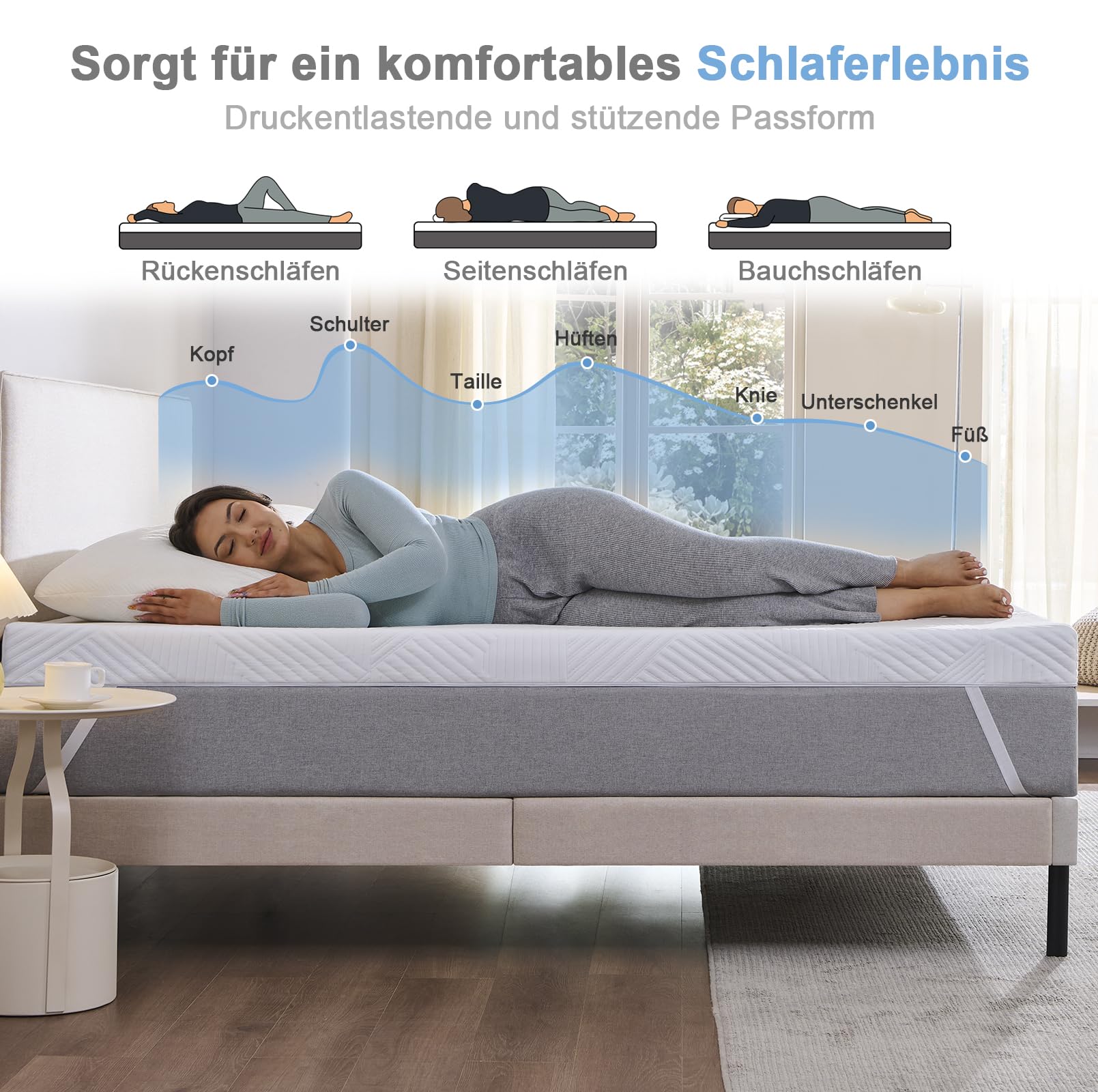 Der Topper verbessert den Schlaf durch sein Zwei-Schichten-System: Eine anpassungsfähige Memory-Schaum-Schicht sorgt für optimale Druckentlastung, während eine Stützschicht Stabilität bietet. Der atmungsaktive Bezug mit Gel-Partikeln reguliert zudem die Temperatur für ein angenehmes Schlafklima.