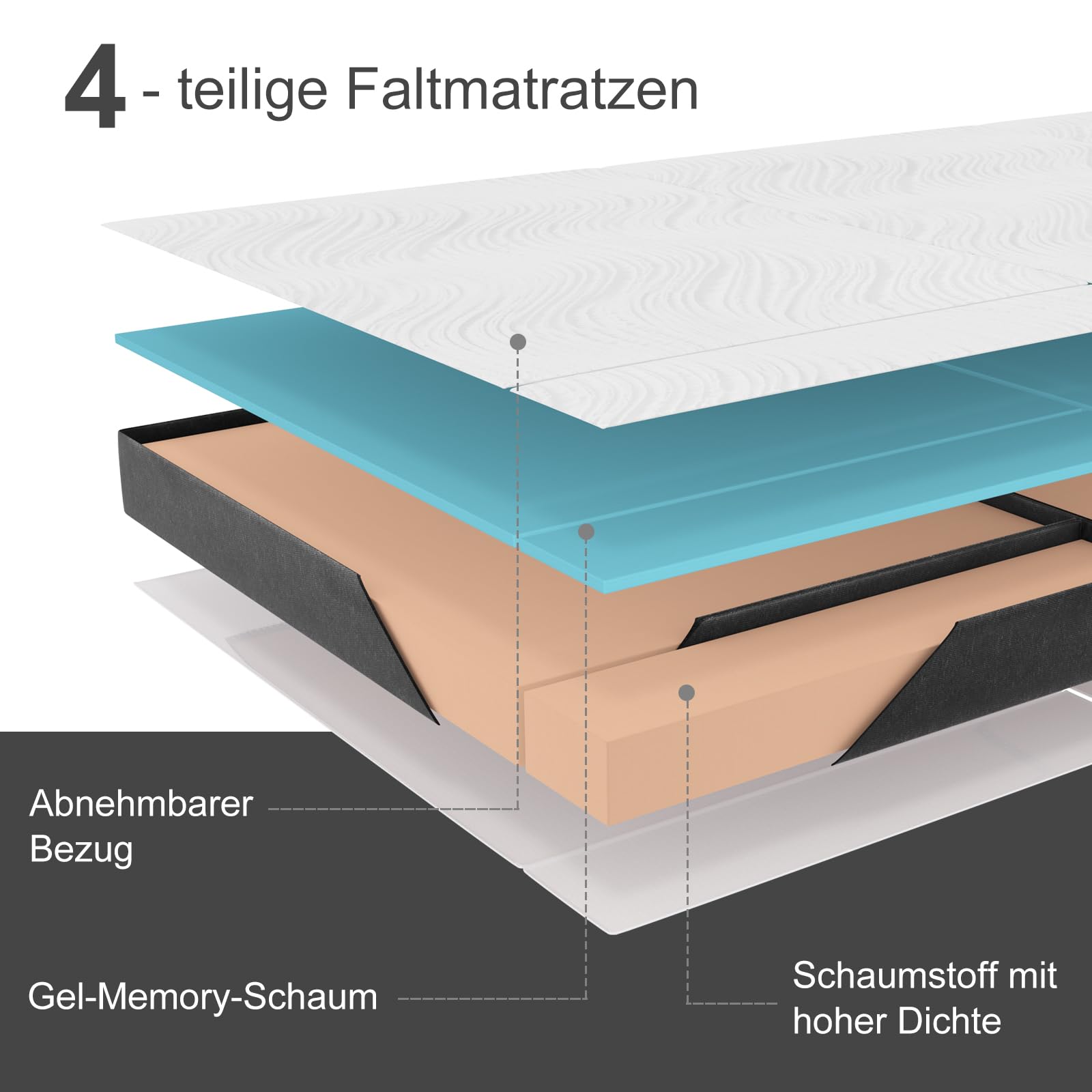 - Kompaktes Design: Die Matratze ist 4-teilig faltbar und kann so platzsparend verstaut werden, wenn sie nicht gebraucht wird.