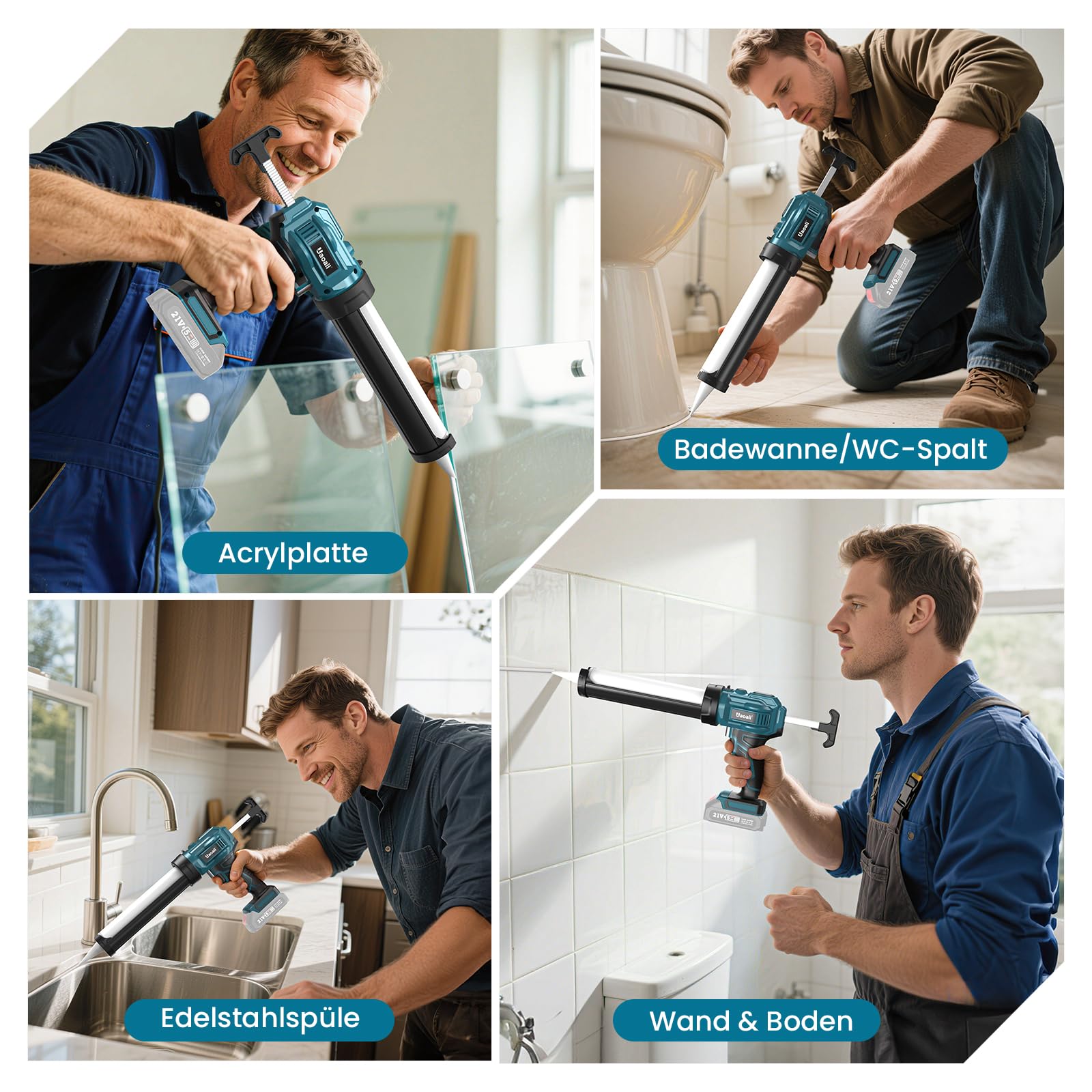 Vielseitig einsetzbar: Diese elektrische Silikonspritze ist ein flexibler Helfer für eine breite Palette an Aufgaben, wie das Abdichten von Fenstern, Türen, Badewannen oder Wänden. Sie unterstützt Profis und Heimwerker gleichermassen.