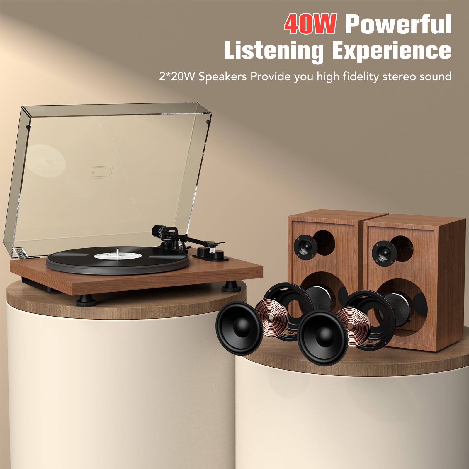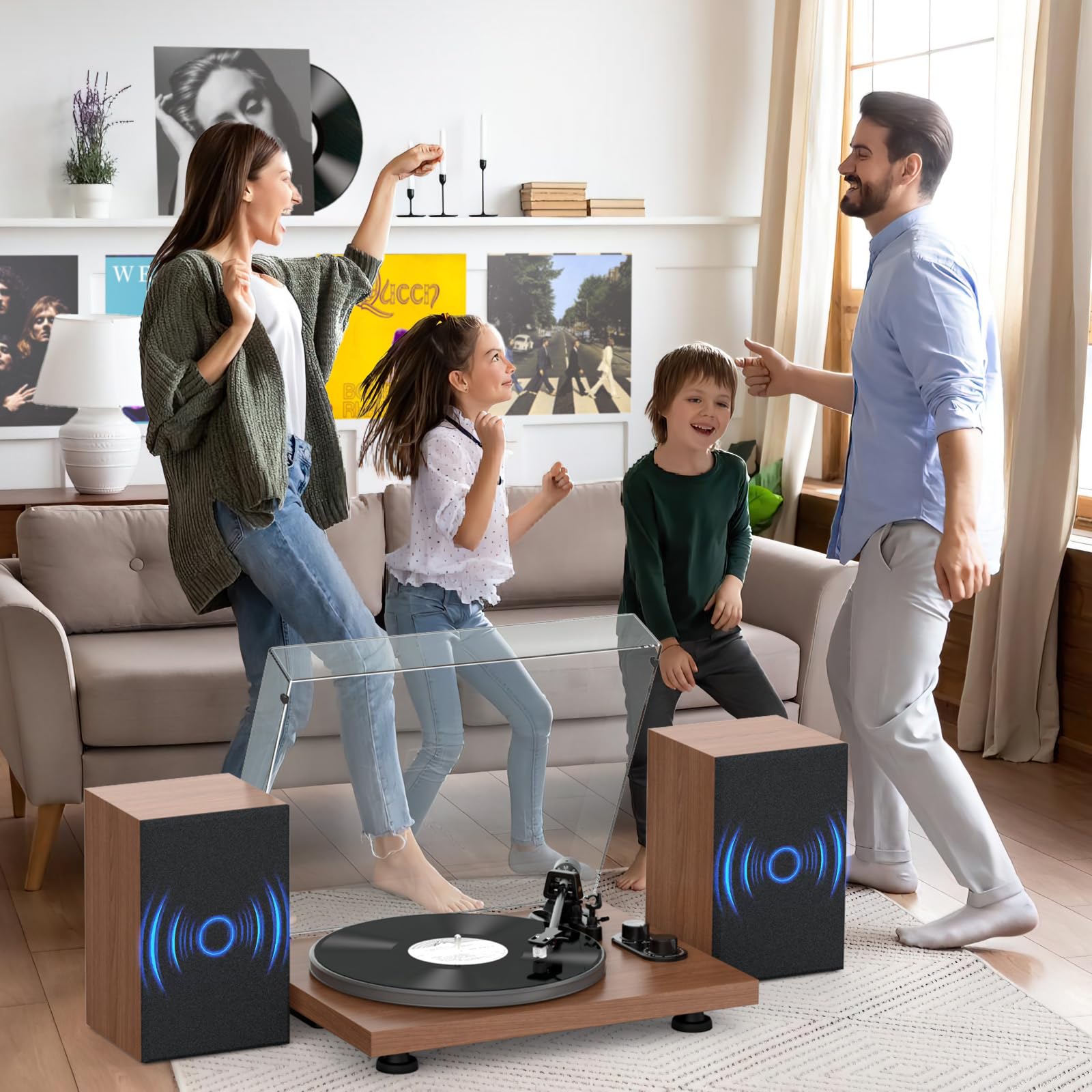 - Duale Bluetooth-Funktion: Verbinden Sie den Plattenspieler kabellos mit Bluetooth-Kopfhörern (Ausgang) oder streamen Sie Musik von Ihrem Smartphone auf die mitgelieferten Lautsprecher (Eingang).