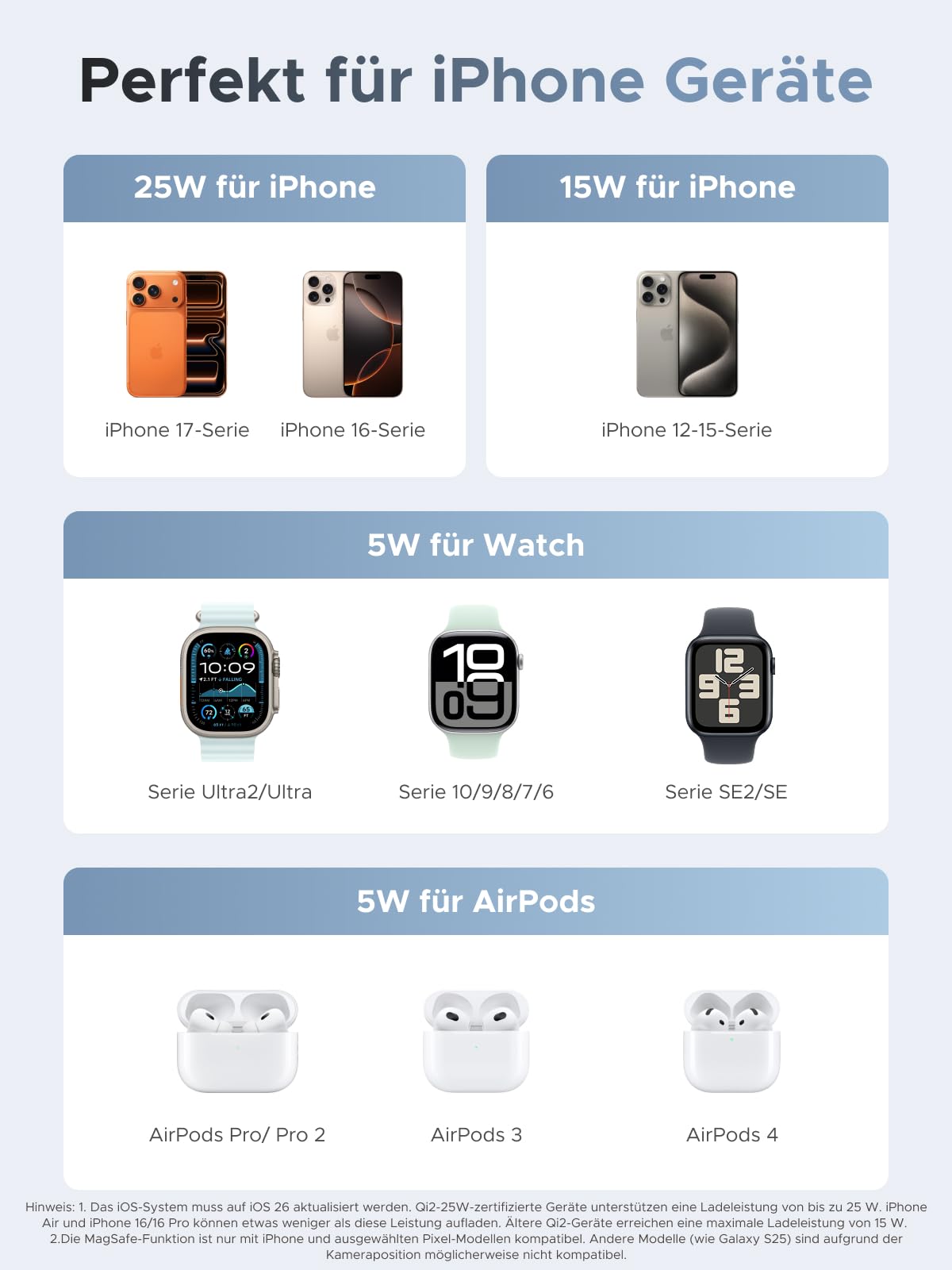 - Um die maximale Ladeleistung von 25W für die iPhone 16-17-Serie zu erreichen, ist iOS 26 (oder neuer) sowie die Verwendung des mitgelieferten 45W-Netzteils und eines 60W-fähigen Kabels erforderlich.