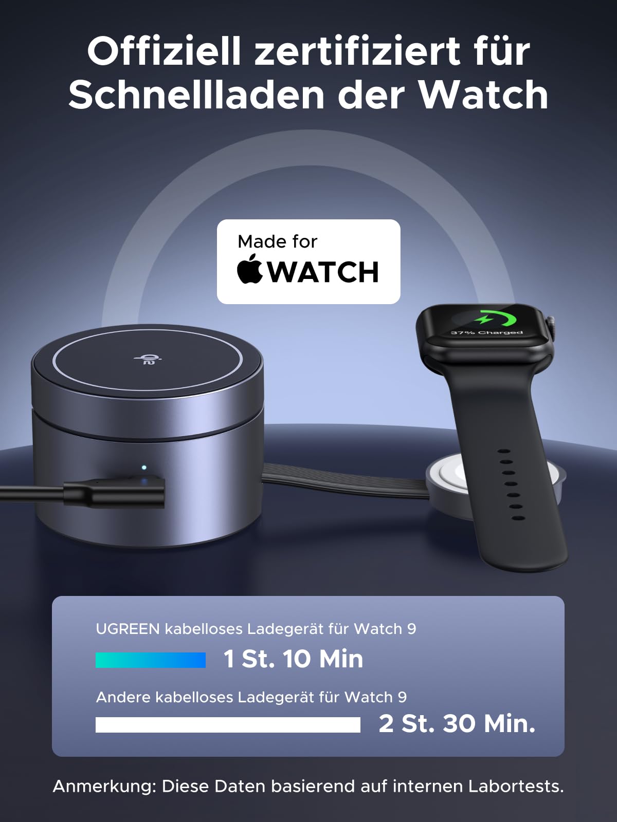- MFW-Schnellladung für die Apple Watch: Dank der "Made for Watch"-Zertifizierung ist Ihre Apple Watch 9 in nur 70 Minuten wieder voll einsatzbereit. (Nicht geeignet für Uhren mit besonders dicken Armbändern.)