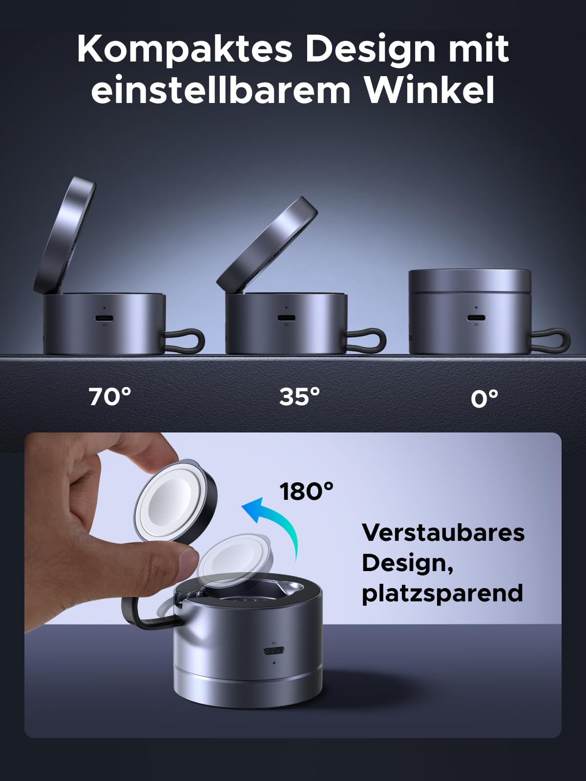 - Flexibles und faltbares Design: Passen Sie den Betrachtungswinkel für Ihr iPhone um bis zu 70° an Ihre Bedürfnisse an. Für den Transport oder zur Aufbewahrung lässt sich die Station kompakt zusammenklappen und sorgt für einen aufgeräumten Schreibtisch ohne Kabelsalat.