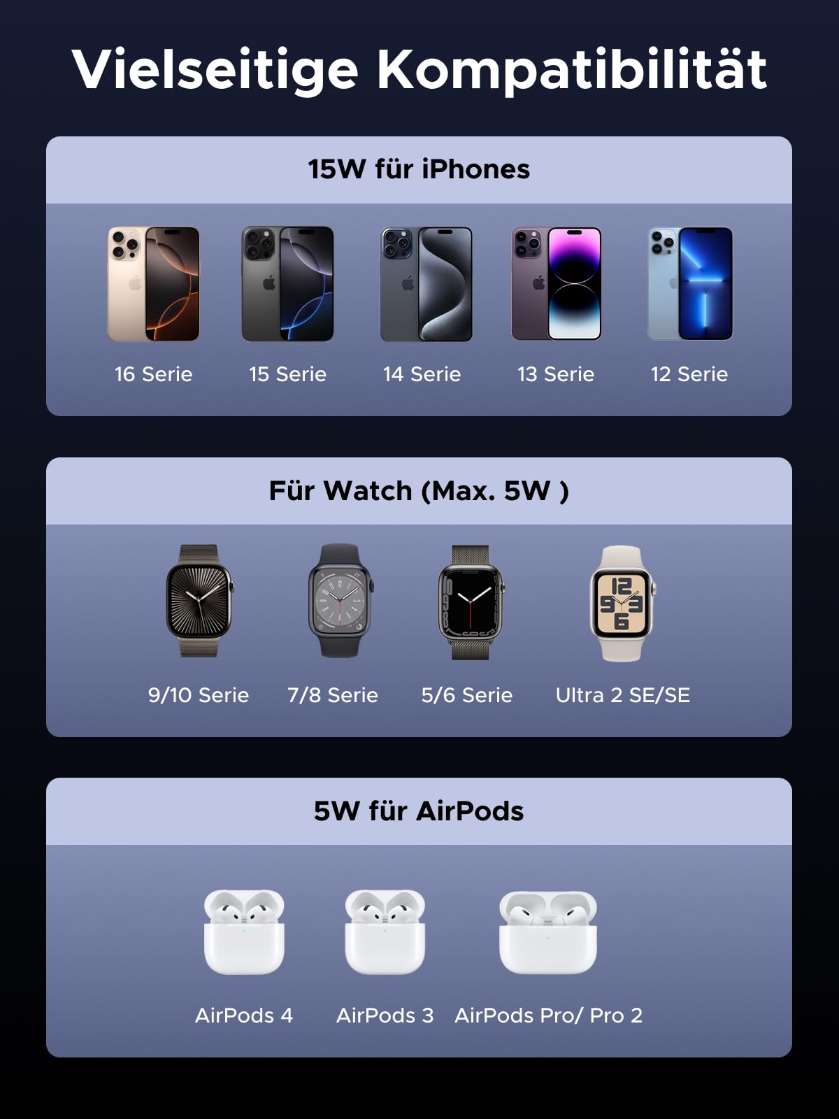 Sie können drei Apple-Geräte simultan aufladen: Ein iPhone der Serie 12 bis 17 (oder neuer) über den MagSafe-Anschluss, eine Apple Watch (alle Modelle, die Schnellladen unterstützen) und AirPods mit kabellosem Ladecase.