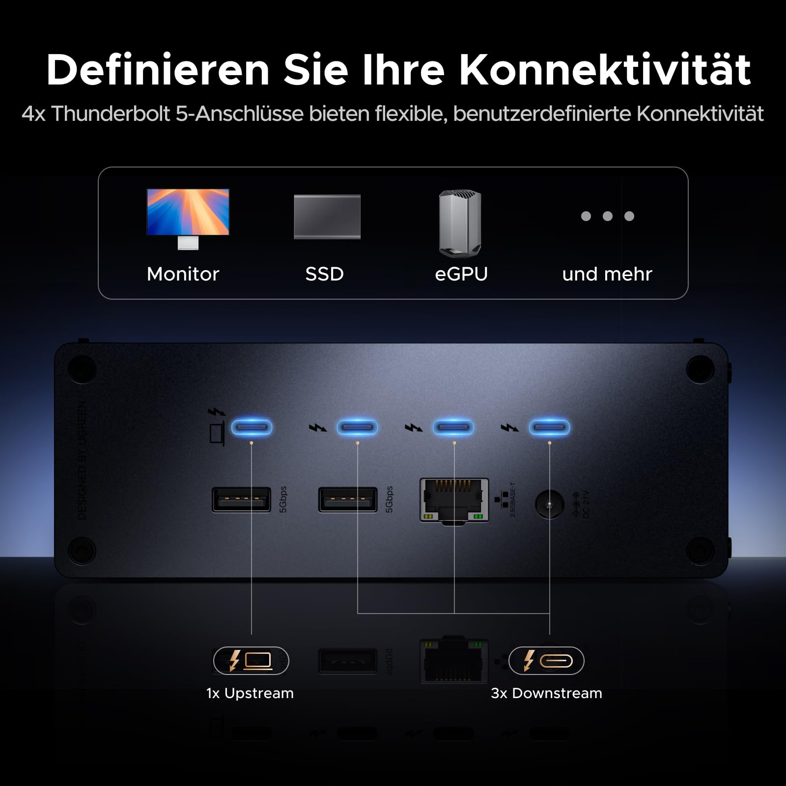 Diese Dockingstation ist die kompromisslose Lösung für professionelle Anwender wie Video-Cutter, 3D-Artists, Entwickler und Content Creators, die maximale Leistung und Konnektivität verlangen. Dank ultraschnellem Datentransfer via Thunderbolt 5, 2.5-Gbit/s-Ethernet und Unterstützung für hochauflösende Displays verwandelt sie jeden Schreibtisch in eine hocheffiziente Kommandozentrale.